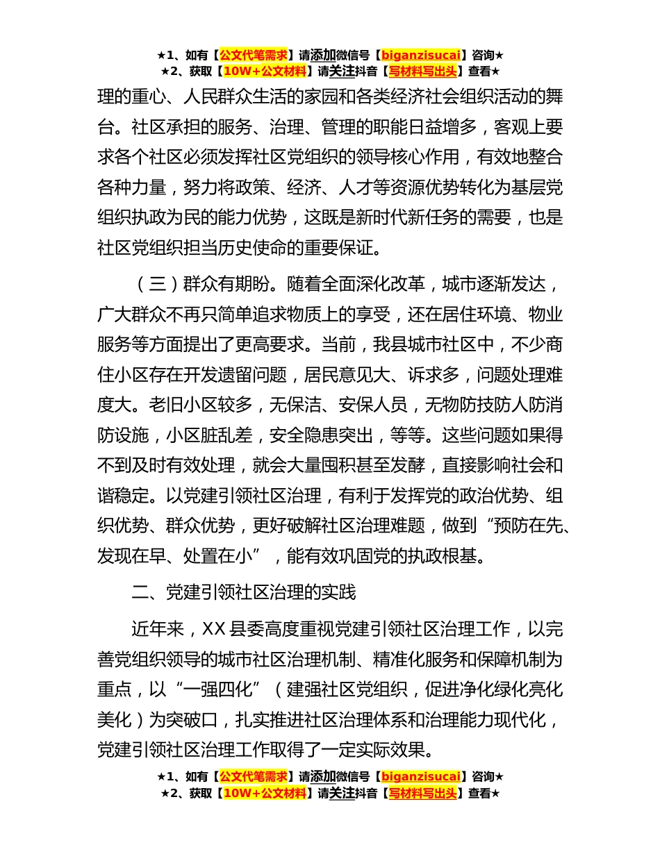 ★1、如有【公文代笔需求】请添加微信号【biganzisucai】咨询★★2、获取【10W+公文材料】请关注抖音【写材料写出头】查看★关于党建引领社区治理的实践与思考中央办公厅印发的《关于加强和改进城市基层党的建设工作的意见》指出:“要把社区党组织建设得更加坚强有力,提升党组织领导基层治理工作水平”。社区党组织是实现社区有效治理的核心力量,必须把党的基层组织建设放在首位,以党的建设贯穿、保障、引领社区治理。一、党建引领社区治理的重要意义社区是城市的细胞,是党在城市工作的基础。社区党组织发挥着凝聚人心、服务群众、促进和谐的重要作用。以党建引领社区治理,对于巩固党的执政基础具有重要意义。(一)上级有要求。党的二十大报告明确要求,加强社区治理体系建设,推动社会治理重心向基层下移...