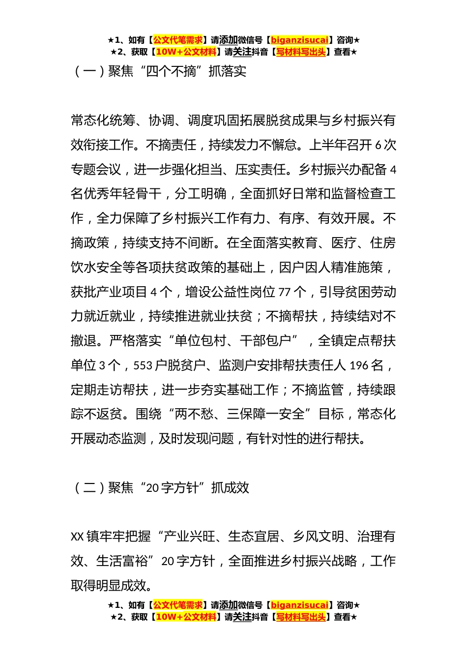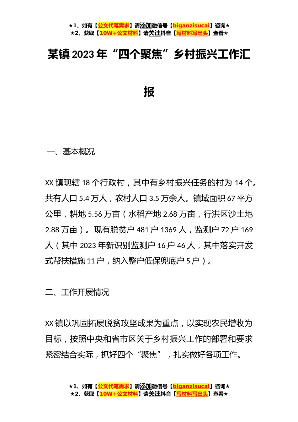 ★1、如有【公文代笔需求】请添加微信号【biganzisucai】咨询★★2、获取【10W+公文材料】请关注抖音【写材料写出头】查看★某镇2023年“四个聚焦”乡村振兴工作汇报一、基本概况XX镇现辖18个行政村,其中有乡村振兴任务的村为14个。共有人口5.4万人,农村人口3.5万余人。镇域面积67平方公里,耕地5.56万亩(水稻产地2.68万亩,行洪区沙土地2.88万亩)。现有脱贫户481户1369人,监测户72户169人(其中2023年新识别监测户16户46人,其中落实开发式帮扶措施11户,纳入整户低保兜底户5户)。二、工作开展情况XX镇以巩固拓展脱贫攻坚成果为重点,以实现农民增收为目标,按照中央和省市区关于乡村振兴工作的部署和要求紧密结合实际,抓好四个“聚焦”,扎实做好各项工作。★1、如有【公文代笔需求】请添加微信号【bigan...