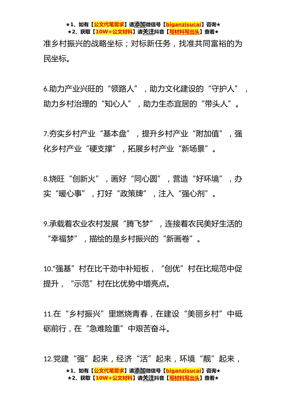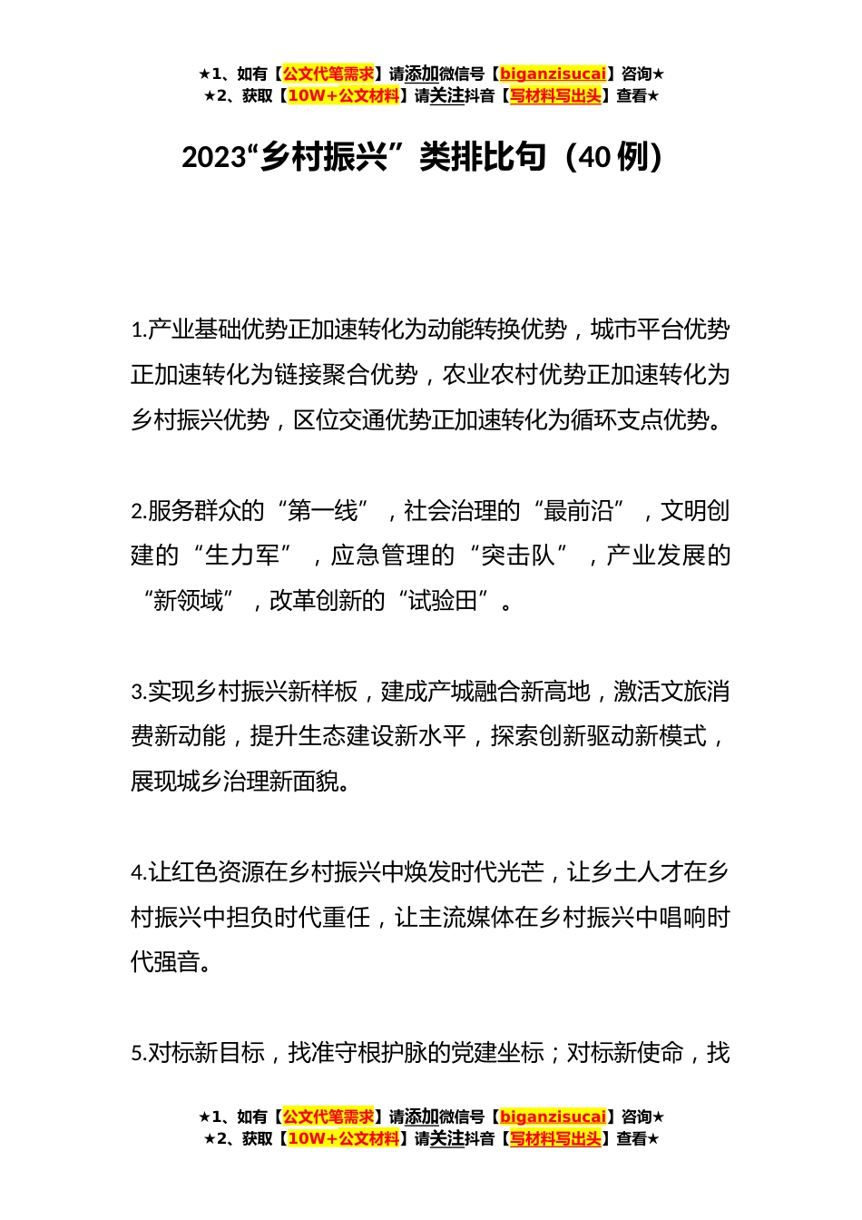 ★1、如有【公文代笔需求】请添加微信号【biganzisucai】咨询★★2、获取【10W+公文材料】请关注抖音【写材料写出头】查看★2023“乡村振兴”类排比句(40例)1.产业基础优势正加速转化为动能转换优势,城市平台优势正加速转化为链接聚合优势,农业农村优势正加速转化为乡村振兴优势,区位交通优势正加速转化为循环支点优势。2.服务群众的“第一线”,社会治理的“最前沿”,文明创建的“生力军”,应急管理的“突击队”,产业发展的“新领域”,改革创新的“试验田”。3.实现乡村振兴新样板,建成产城融合新高地,激活文旅消费新动能,提升生态建设新水平,探索创新驱动新模式,展现城乡治理新面貌。4.让红色资源在乡村振兴中焕发时代光芒,让乡土人才在乡村振兴中担负时代重任,让主流媒体在乡村振兴中唱响时代...