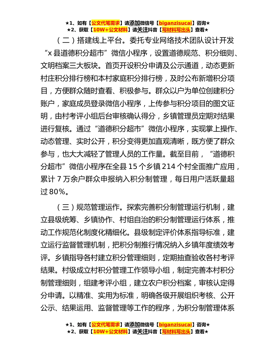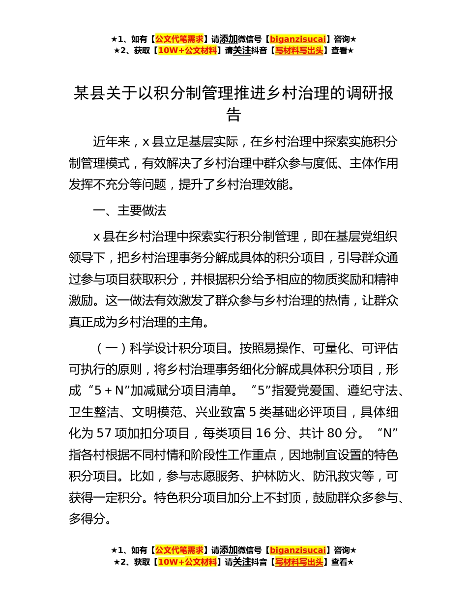 ★1、如有【公文代笔需求】请添加微信号【biganzisucai】咨询★★2、获取【10W+公文材料】请关注抖音【写材料写出头】查看★某县关于以积分制管理推进乡村治理的调研报告近年来,x县立足基层实际,在乡村治理中探索实施积分制管理模式,有效解决了乡村治理中群众参与度低、主体作用发挥不充分等问题,提升了乡村治理效能。一、主要做法x县在乡村治理中探索实行积分制管理,即在基层党组织领导下,把乡村治理事务分解成具体的积分项目,引导群众通过参与项目获取积分,并根据积分给予相应的物质奖励和精神激励。这一做法有效激发了群众参与乡村治理的热情,让群众真正成为乡村治理的主角。(一)科学设计积分项目。按照易操作、可量化、可评估可执行的原则,将乡村治理事务细化分解成具体积分项目,形成“5+N”加...