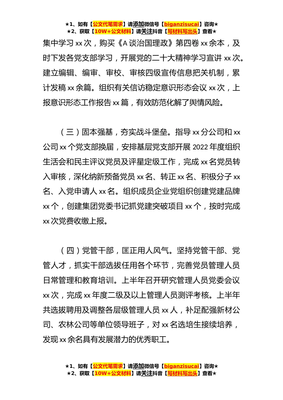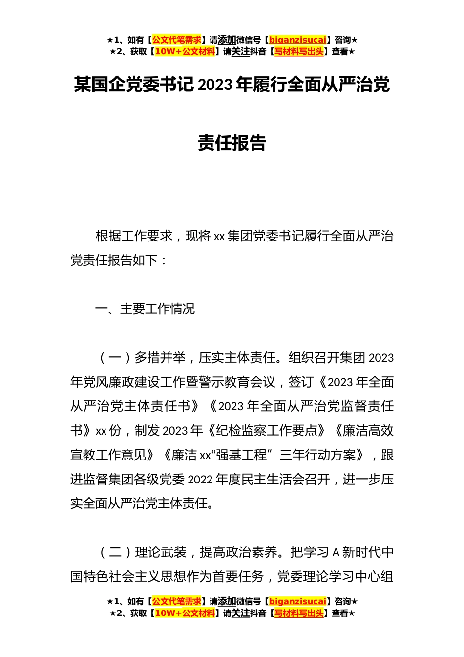 ★1、如有【公文代笔需求】请添加微信号【biganzisucai】咨询★★2、获取【10W+公文材料】请关注抖音【写材料写出头】查看★某国企党委书记2023年履行全面从严治党责任报告根据工作要求,现将xx集团党委书记履行全面从严治党责任报告如下:一、主要工作情况(一)多措并举,压实主体责任。组织召开集团2023年党风廉政建设工作暨警示教育会议,签订《2023年全面从严治党主体责任书》《2023年全面从严治党监督责任书》xx份,制发2023年《纪检监察工作要点》《廉洁高效宣教工作意见》《廉洁xx“强基工程”三年行动方案》,跟进监督集团各级党委2022年度民主生活会召开,进一步压实全面从严治党主体责任。(二)理论武装,提高政治素养。把学习A新时代中国特色社会主义思想作为首要任务,党委理论学习中心组★1、如有...