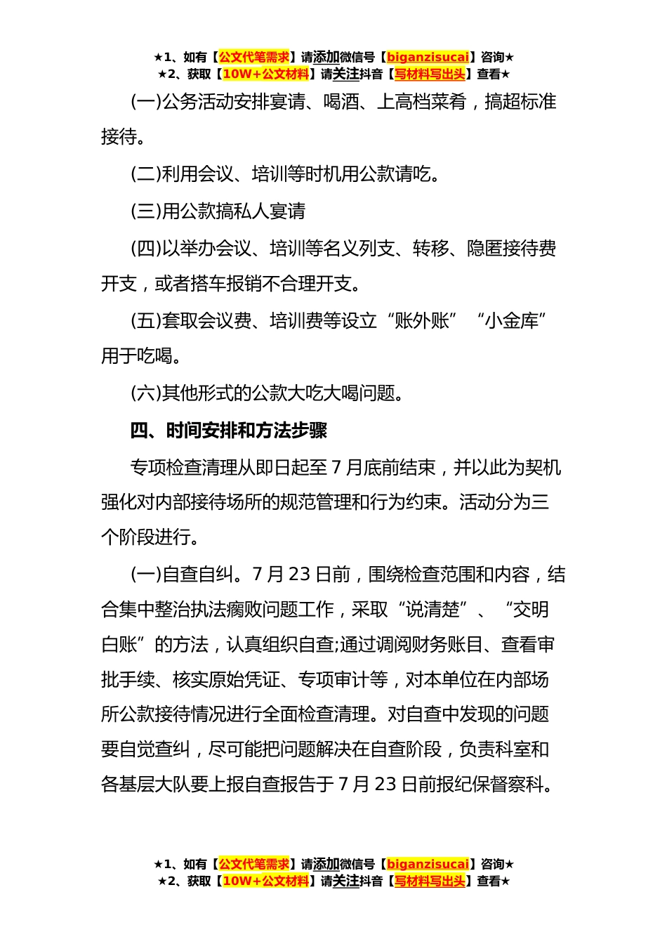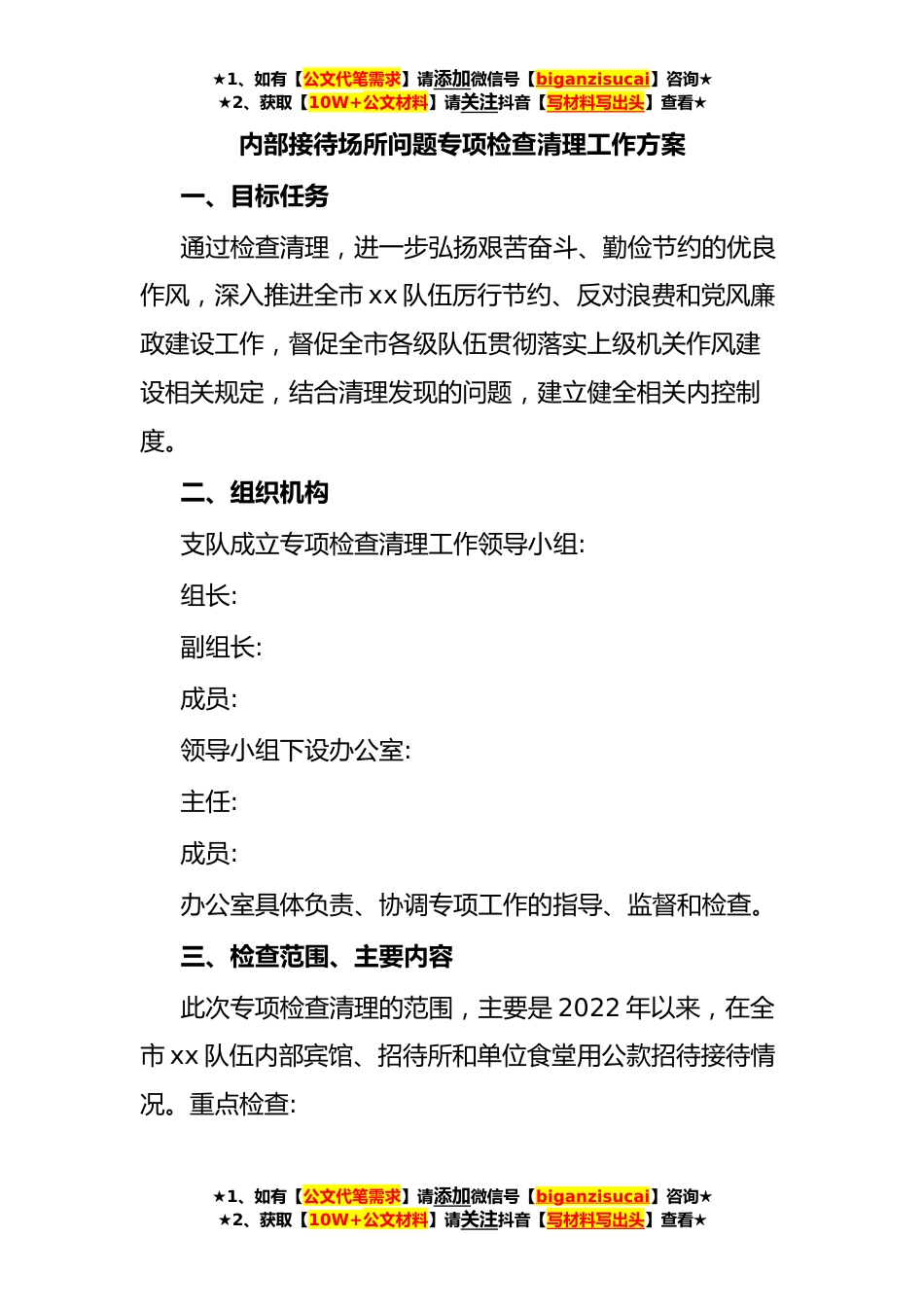 ★1、如有【公文代笔需求】请添加微信号【biganzisucai】咨询★★2、获取【10W+公文材料】请关注抖音【写材料写出头】查看★内部接待场所问题专项检查清理工作方案一、目标任务通过检查清理,进一步弘扬艰苦奋斗、勤俭节约的优良作风,深入推进全市xx队伍厉行节约、反对浪费和党风廉政建设工作,督促全市各级队伍贯彻落实上级机关作风建设相关规定,结合清理发现的问题,建立健全相关内控制度。二、组织机构支队成立专项检查清理工作领导小组:组长:副组长:成员:领导小组下设办公室:主任:成员:办公室具体负责、协调专项工作的指导、监督和检查。三、检查范围、主要内容此次专项检查清理的范围,主要是2022年以来,在全市xx队伍内部宾馆、招待所和单位食堂用公款招待接待情况。重点检查:★1、如有【公文代笔需求】请...