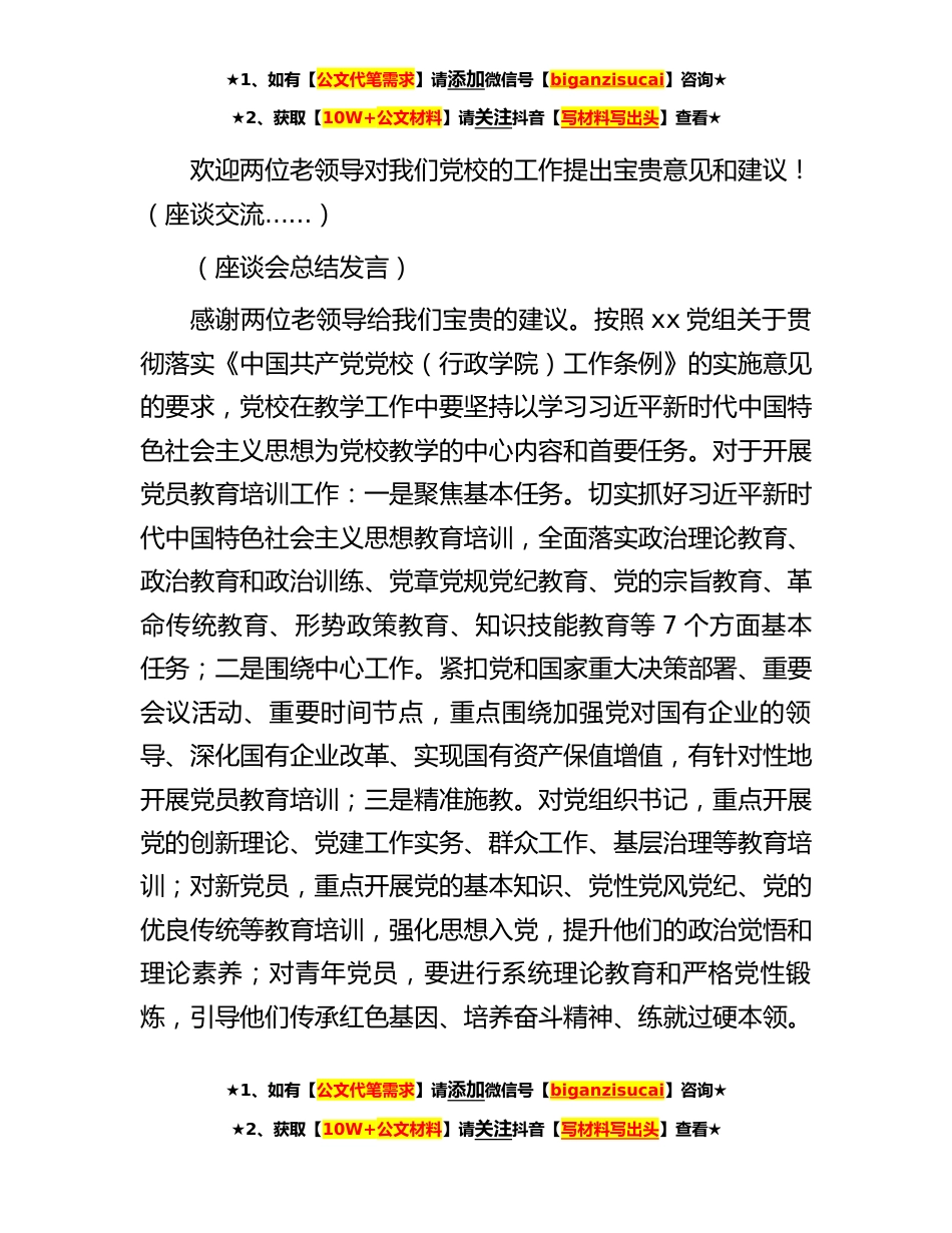 ★1、如有【公文代笔需求】请添加微信号【biganzisucai】咨询★★2、获取【10W+公文材料】请关注抖音【写材料写出头】查看★党校校长在党校工作座谈会上的讲话党校校长在党校工作座谈会上的讲话同志们:大家上午好!今天非常荣幸地邀请到XX、XX两位资深的XX领导参加XX地区党校工作座谈会,欢迎您们莅临指导工作!同时非常感谢两位领导对党校工作的支持!首先请党校专职副校长xx同志介绍党校工作情况。(XX同志介绍党校工作情况)刚刚XX校长简要介绍了党校的概况,教育培训开展、工作特色、工作成效、工作展望等基本情况。目前XX地区党校“”的讲师实施外引内请方式。外引师资方面,主要以党校、高校以及行政部门专家领导为主;内请师资以xx系统内部领导干部以及一线实践者为主力,如XX地区党委书记主讲形势任务教...