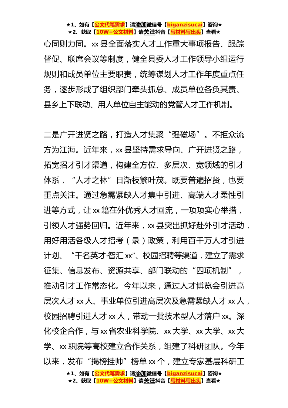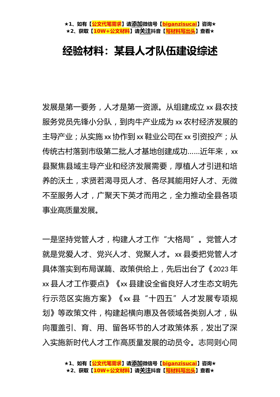 ★1、如有【公文代笔需求】请添加微信号【biganzisucai】咨询★★2、获取【10W+公文材料】请关注抖音【写材料写出头】查看★经验材料:某县人才队伍建设综述发展是第一要务,人才是第一资源。从组建成立xx县农技服务党员先锋小分队,到肉牛产业成为xx农村经济发展的主导产业;从实施xx协作到xx鞋业公司在xx引资投产;从传统古村落到市级第二批人才基地创建成功……近年来,xx县聚焦县域主导产业和经济发展需要,厚植人才引进和培养的沃土,求贤若渴寻觅人才、各尽其能用好人才、无微不至服务人才,广聚天下英才而用之,全力推动全县各项事业高质量发展。一是坚持党管人才,构建人才工作“大格局”。党管人才就是党爱人才、党兴人才、党聚人才。xx县委把党管人才具体落实到布局谋篇、政策供给上,先后出台了《2023...