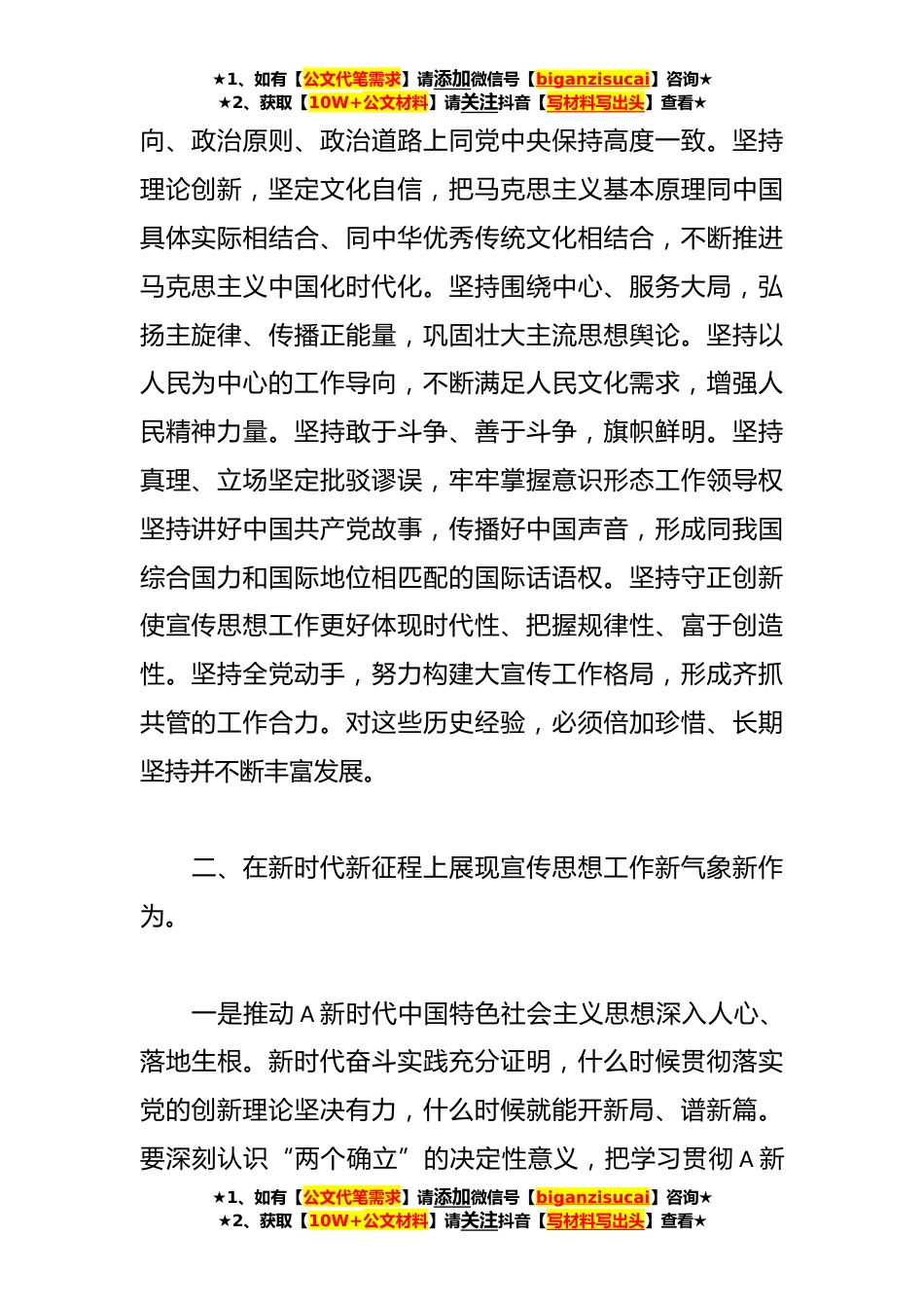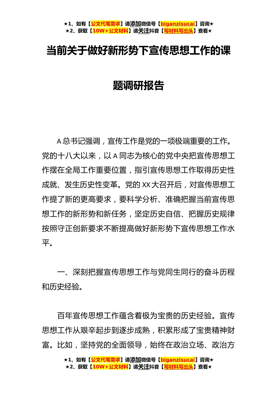 ★1、如有【公文代笔需求】请添加微信号【biganzisucai】咨询★★2、获取【10W+公文材料】请关注抖音【写材料写出头】查看★当前关于做好新形势下宣传思想工作的课题调研报告A总书记强调,宣传工作是党的一项极端重要的工作。党的十八大以来,以A同志为核心的党中央把宣传思想工作摆在全局工作重要位置,指引宣传思想工作取得历史性成就、发生历史性变革。党的XX大召开后,对宣传思想工作提了新的更高要求,要科学分析、准确把握当前宣传思想工作的新形势和新任务,坚定历史自信、把握历史规律按照守正创新要求不断提高做好新形势下宣传思想工作水平。一、深刻把握宣传思想工作与党同生同行的奋斗历程和历史经验。百年宣传思想工作蕴含着极为宝贵的历史经验。宣传思想工作从艰辛起步到逐步成熟,积累形成了宝贵精...