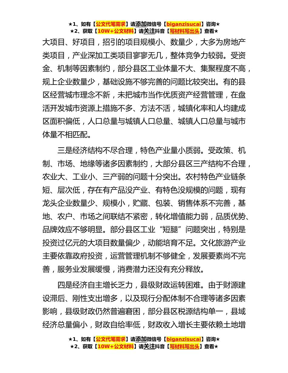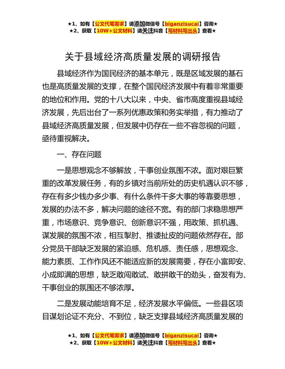 ★1、如有【公文代笔需求】请添加微信号【biganzisucai】咨询★★2、获取【10W+公文材料】请关注抖音【写材料写出头】查看★关于县域经济高质量发展的调研报告县域经济作为国民经济的基本单元,既是区域发展的基石也是高质量发展的支撑,在整个国民经济发展中有着非常重要的地位和作用。党的十八大以来,中央、省市高度重视县域经济发展,先后出台了一系列优惠政策和务实举措,有力推动了县域经济高质量发展,但发展中仍存在一些不容忽视的问题,亟待重视解决。一、存在问题一是思想观念不够解放,干事创业氛围不浓。面对艰巨繁重的改革发展任务,有的乡镇对当前所处的历史机遇认识不够,存在有多少钱办多少事、有什么条件干多大事的等靠要思想,发展的办法不多,解决问题的途径不宽。有的部门求稳思想严重,市场...