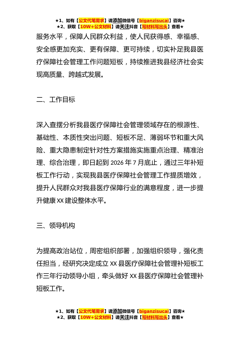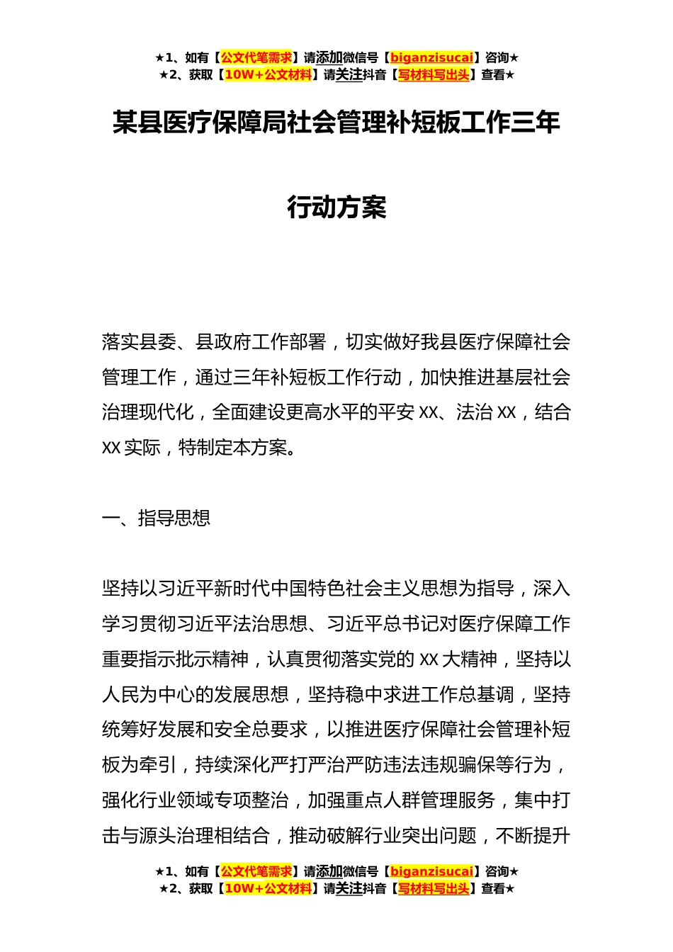 ★1、如有【公文代笔需求】请添加微信号【biganzisucai】咨询★★2、获取【10W+公文材料】请关注抖音【写材料写出头】查看★某县医疗保障局社会管理补短板工作三年行动方案落实县委、县政府工作部署,切实做好我县医疗保障社会管理工作,通过三年补短板工作行动,加快推进基层社会治理现代化,全面建设更高水平的平安XX、法治XX,结合XX实际,特制定本方案。一、指导思想坚持以习近平新时代中国特色社会主义思想为指导,深入学习贯彻习近平法治思想、习近平总书记对医疗保障工作重要指示批示精神,认真贯彻落实党的XX大精神,坚持以人民为中心的发展思想,坚持稳中求进工作总基调,坚持统筹好发展和安全总要求,以推进医疗保障社会管理补短板为牵引,持续深化严打严治严防违法违规骗保等行为,强化行业领域专项整...