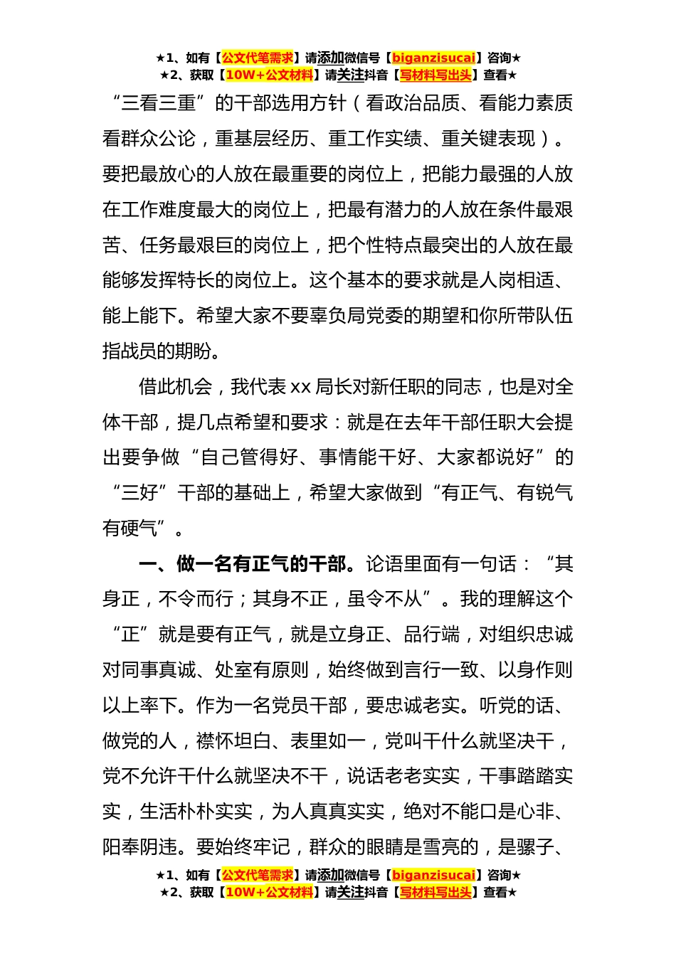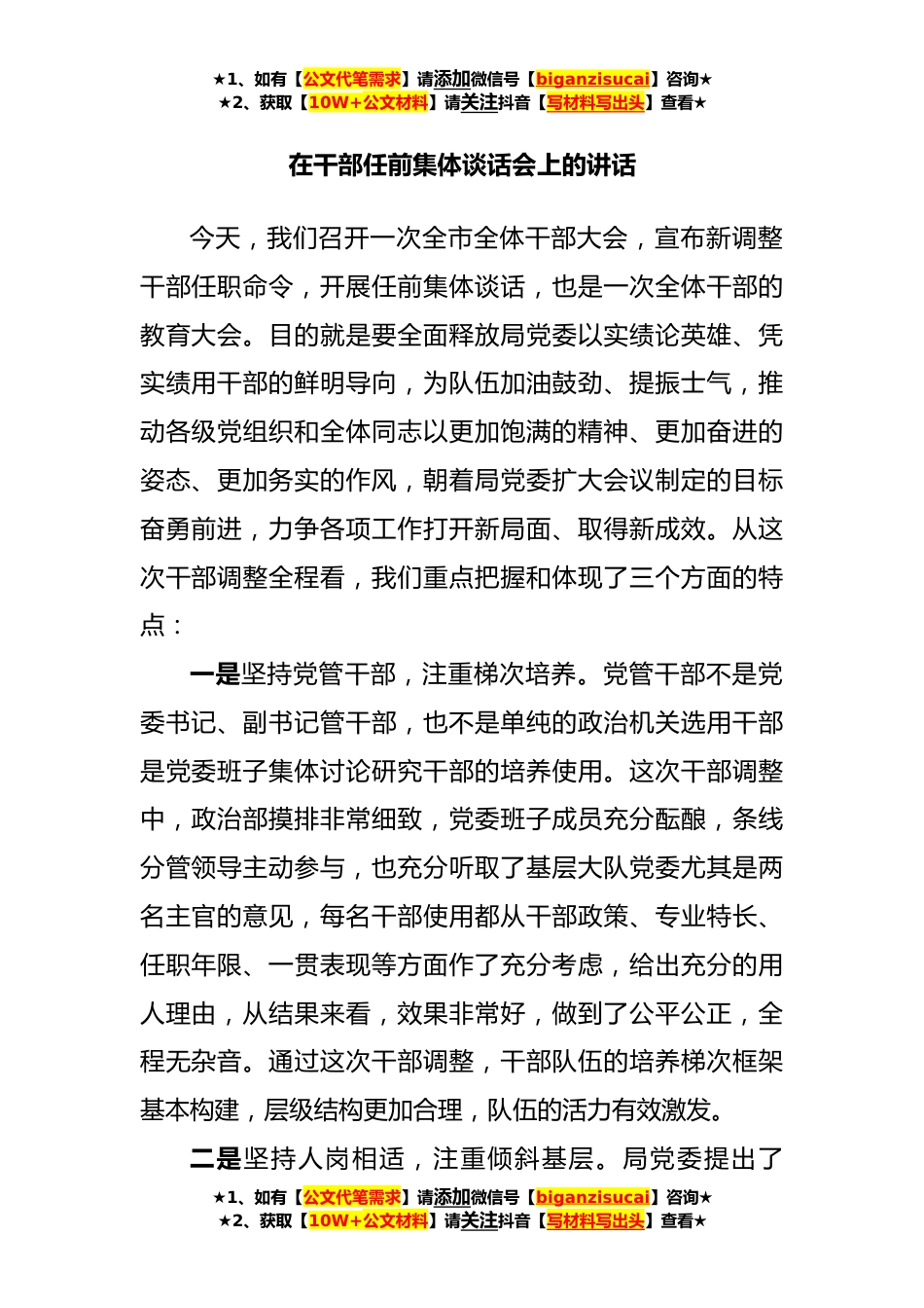 ★1、如有【公文代笔需求】请添加微信号【biganzisucai】咨询★★2、获取【10W+公文材料】请关注抖音【写材料写出头】查看★在干部任前集体谈话会上的讲话今天,我们召开一次全市全体干部大会,宣布新调整干部任职命令,开展任前集体谈话,也是一次全体干部的教育大会。目的就是要全面释放局党委以实绩论英雄、凭实绩用干部的鲜明导向,为队伍加油鼓劲、提振士气,推动各级党组织和全体同志以更加饱满的精神、更加奋进的姿态、更加务实的作风,朝着局党委扩大会议制定的目标奋勇前进,力争各项工作打开新局面、取得新成效。从这次干部调整全程看,我们重点把握和体现了三个方面的特点:一是坚持党管干部,注重梯次培养。党管干部不是党委书记、副书记管干部,也不是单纯的政治机关选用干部是党委班子集体讨论研究...