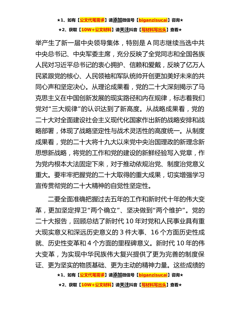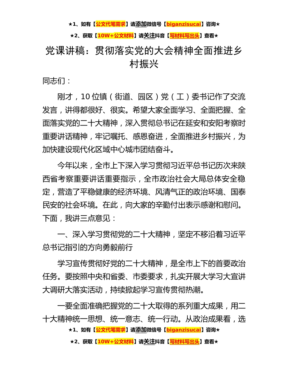 ★1、如有【公文代笔需求】请添加微信号【biganzisucai】咨询★★2、获取【10W+公文材料】请关注抖音【写材料写出头】查看★党课讲稿:贯彻落实党的大会精神全面推进乡村振兴同志们:刚才,10位镇(街道、园区)党(工)委书记作了交流发言,讲得都很好、很实。希望大家全面学习、全面把握、全面落实党的二十大精神,深入贯彻总书记在延安和安阳考察时重要讲话精神,牢记嘱托、感恩奋进,全面推进乡村振兴,为加快建设现代化区域中心城市团结奋斗。今年以来,全市上下深入学习贯彻习近平总书记历次来陕西省考察重要讲话重要指示,全市政治社会大局总体安全稳定,营造了平稳健康的经济环境、风清气正的政治环境、国泰民安的社会环境。在此,向大家的辛勤付出表示感谢和慰问。下面,我讲三点意见:一、深入学习贯彻...