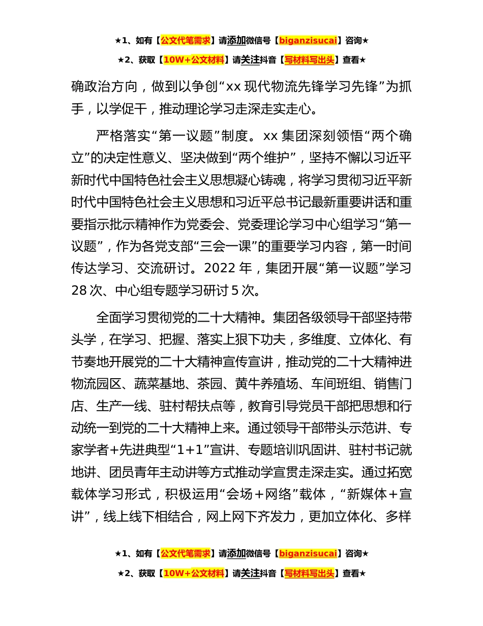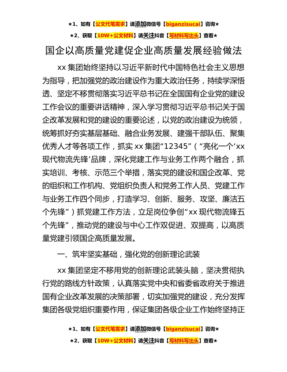 ★1、如有【公文代笔需求】请添加微信号【biganzisucai】咨询★★2、获取【10W+公文材料】请关注抖音【写材料写出头】查看★国企以高质量党建促企业高质量发展经验做法xx集团始终坚持以习近平新时代中国特色社会主义思想为指导,把加强党的政治建设作为重大政治任务,持续学深悟透、坚定不移贯彻落实习近平总书记在全国国有企业党的建设工作会议的重要讲话精神,深入学习贯彻习近平总书记关于国企改革发展和党的建设的重要论述,以党的政治建设为统领,统筹抓好夯实基层基础、融合业务发展、建强干部队伍、聚集优秀人才等各项工作,抓实xx“集团12345”“‘(亮化一个xx’现代物流先锋品牌,深化党建工作与业务工作两个融合,抓实培训、考核、示范三个举措,落实党的建设和国企改革、党的组织和工作机构、党组织负...
