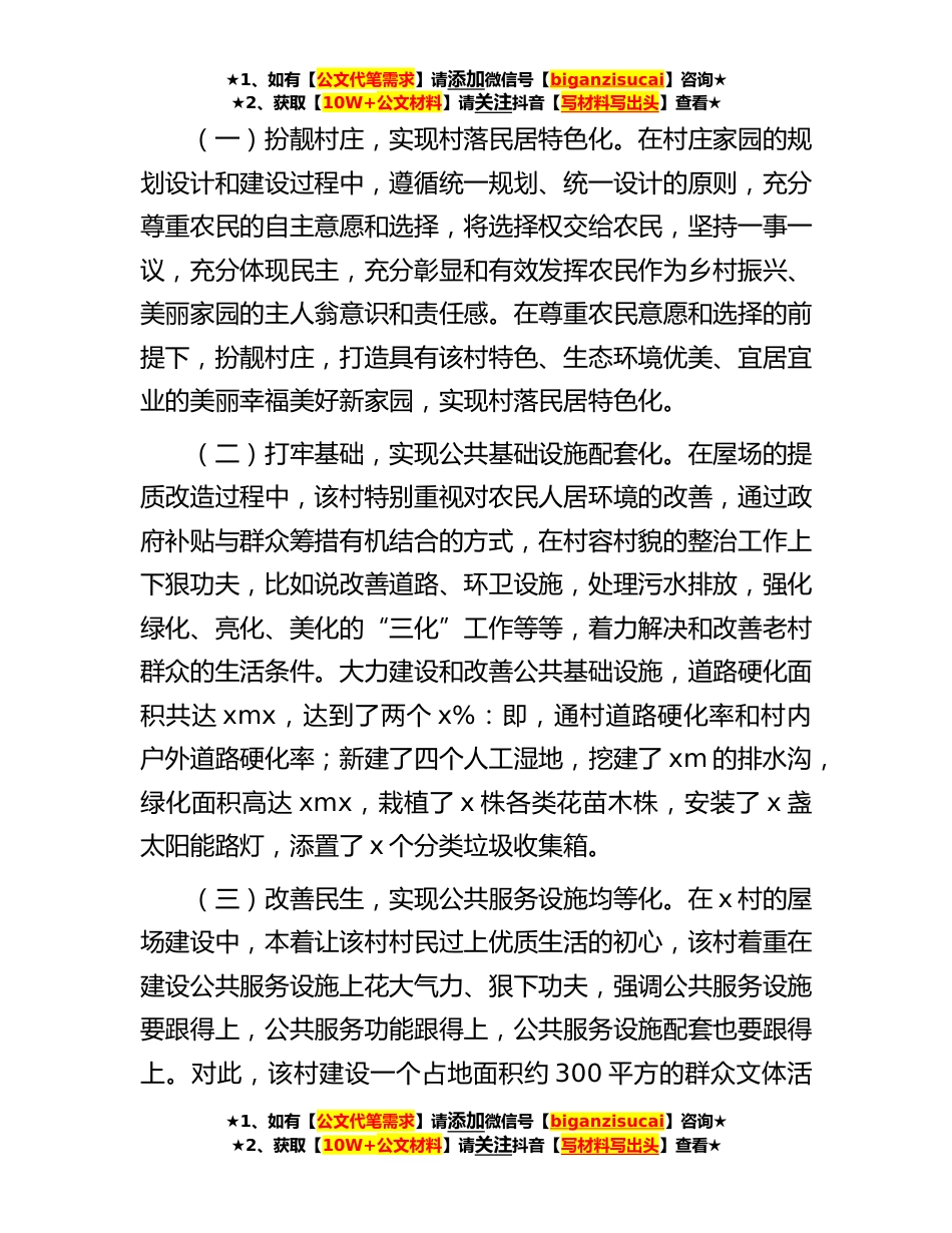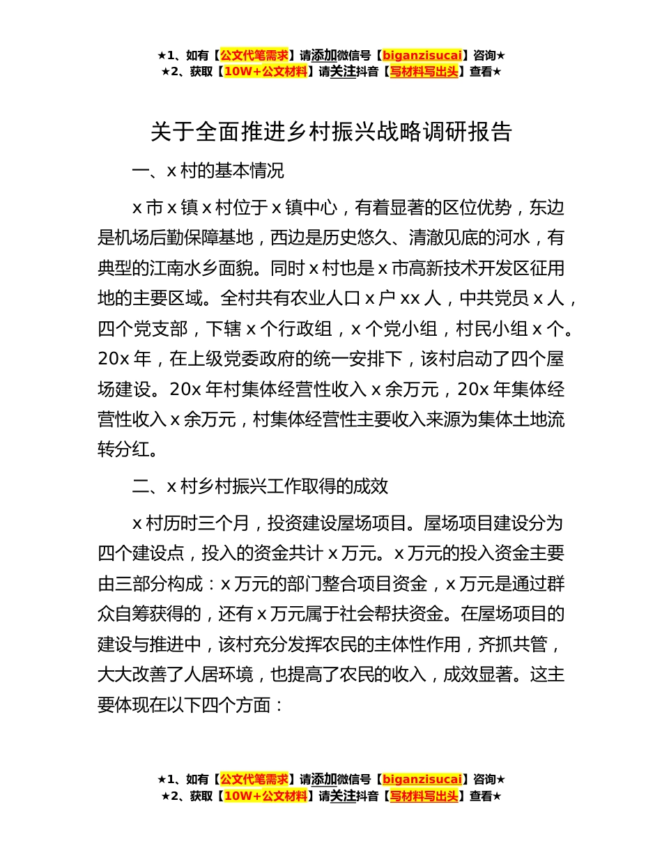 ★1、如有【公文代笔需求】请添加微信号【biganzisucai】咨询★★2、获取【10W+公文材料】请关注抖音【写材料写出头】查看★关于全面推进乡村振兴战略调研报告一、x村的基本情况x市x镇x村位于x镇中心,有着显著的区位优势,东边是机场后勤保障基地,西边是历史悠久、清澈见底的河水,有典型的江南水乡面貌。同时x村也是x市高新技术开发区征用地的主要区域。全村共有农业人口x户xx人,中共党员x人,四个党支部,下辖x个行政组,x个党小组,村民小组x个。20x年,在上级党委政府的统一安排下,该村启动了四个屋场建设。20x年村集体经营性收入x余万元,20x年集体经营性收入x余万元,村集体经营性主要收入来源为集体土地流转分红。二、x村乡村振兴工作取得的成效x村历时三个月,投资建设屋场项目。屋场项目建设分为四个...
