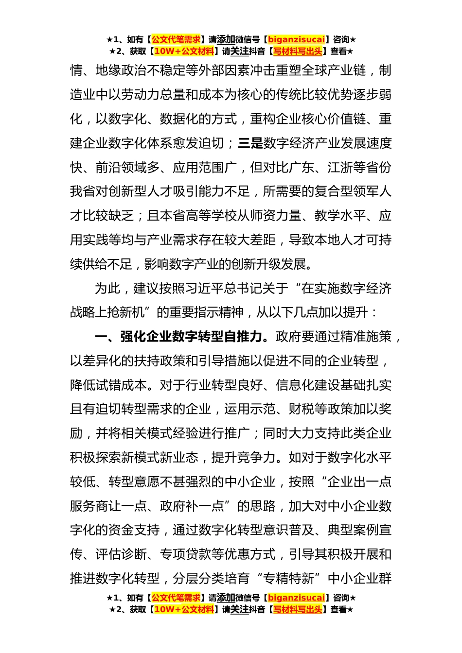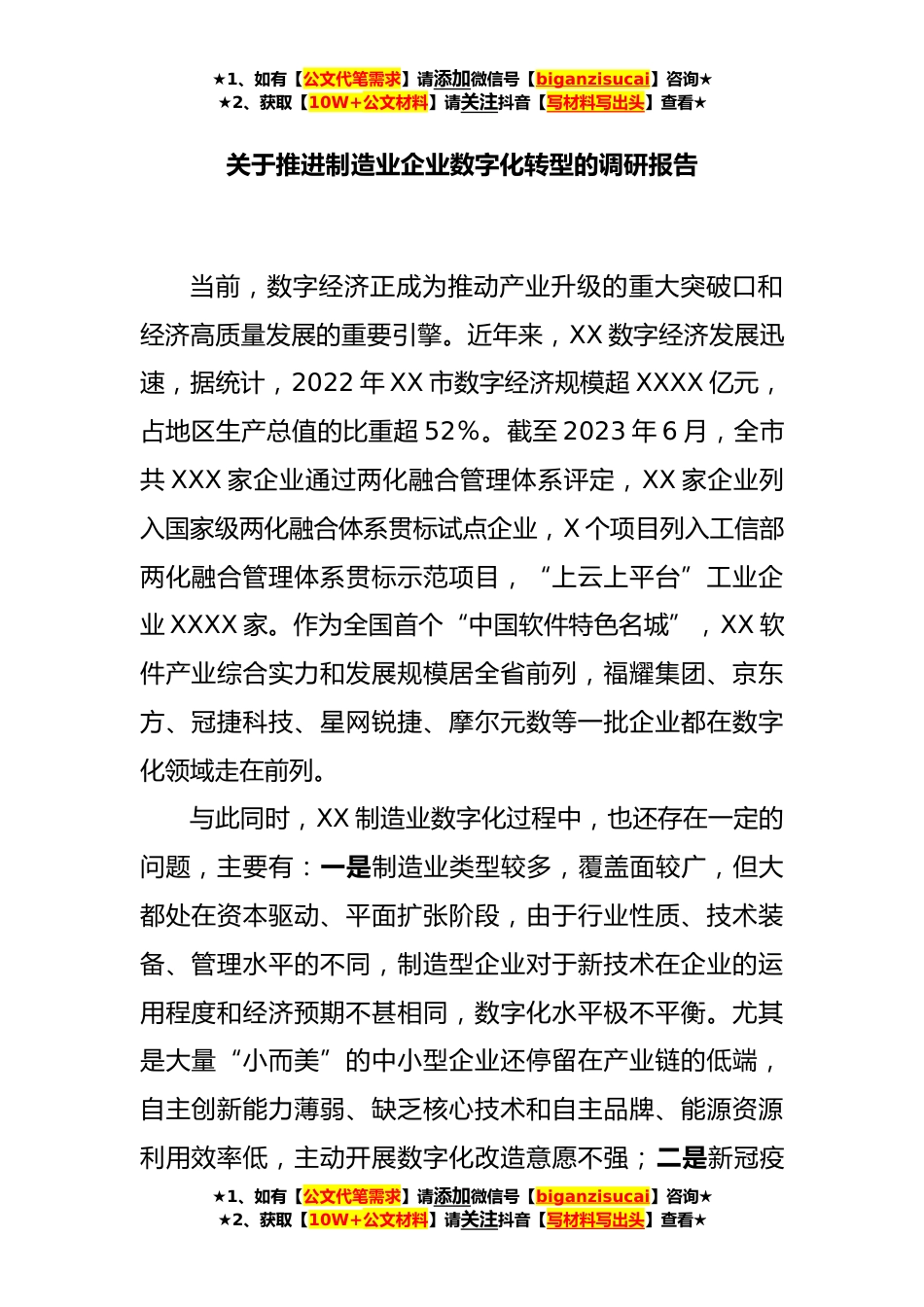 ★1、如有【公文代笔需求】请添加微信号【biganzisucai】咨询★★2、获取【10W+公文材料】请关注抖音【写材料写出头】查看★关于推进制造业企业数字化转型的调研报告当前,数字经济正成为推动产业升级的重大突破口和经济高质量发展的重要引擎。近年来,XX数字经济发展迅速,据统计,2022年XX市数字经济规模超XXXX亿元,占地区生产总值的比重超52%。截至2023年6月,全市共XXX家企业通过两化融合管理体系评定,XX家企业列入国家级两化融合体系贯标试点企业,X个项目列入工信部两化融合管理体系贯标示范项目,“上云上平台”工业企业XXXX家。作为全国首个“中国软件特色名城”,XX软件产业综合实力和发展规模居全省前列,福耀集团、京东方、冠捷科技、星网锐捷、摩尔元数等一批企业都在数字化领域走在前列。与此同时...