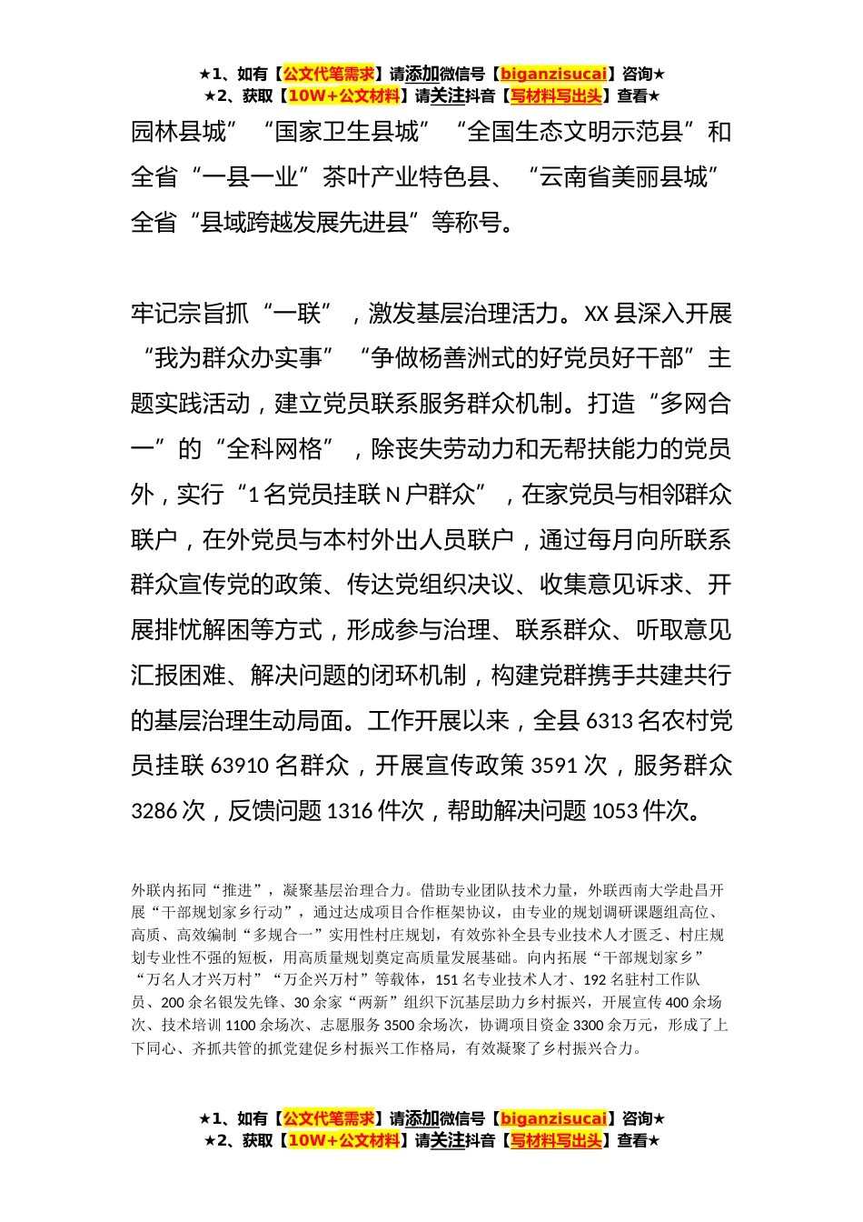 ★1、如有【公文代笔需求】请添加微信号【biganzisucai】咨询★★2、获取【10W+公文材料】请关注抖音【写材料写出头】查看★经验材料:“五组一联”搭把手乡村治理一起走XX县对标乡村振兴“20字”总要求,创新推行“五组一联”工作模式,为基层治理添动力、激活力、聚合力,以组织振兴助推乡村振兴,着力构建基层治理新格局。对标要求创“五组”,增强基层治理动力。XX县以村(社区)为单位,逐一对照“产业兴旺、生态宜居、乡风文明治理有效、生活富裕”每一句话,组建产业振兴、环境提升、文明新风、综合治理、致富帮带五个工作组,由村(社区)党组织书记任总召集人,驻村干部中的党员任组长,农村致富带头人、退休干部等为成员,明确工作职责通过定期开展“产业振兴互帮、环境提升互促、文明新风互育、综合治...