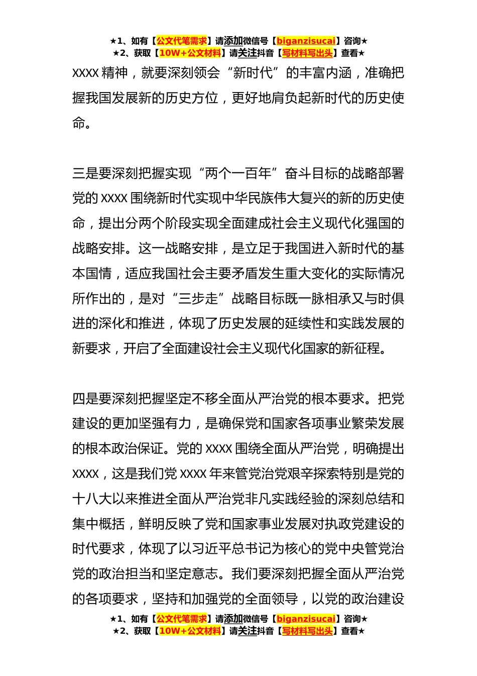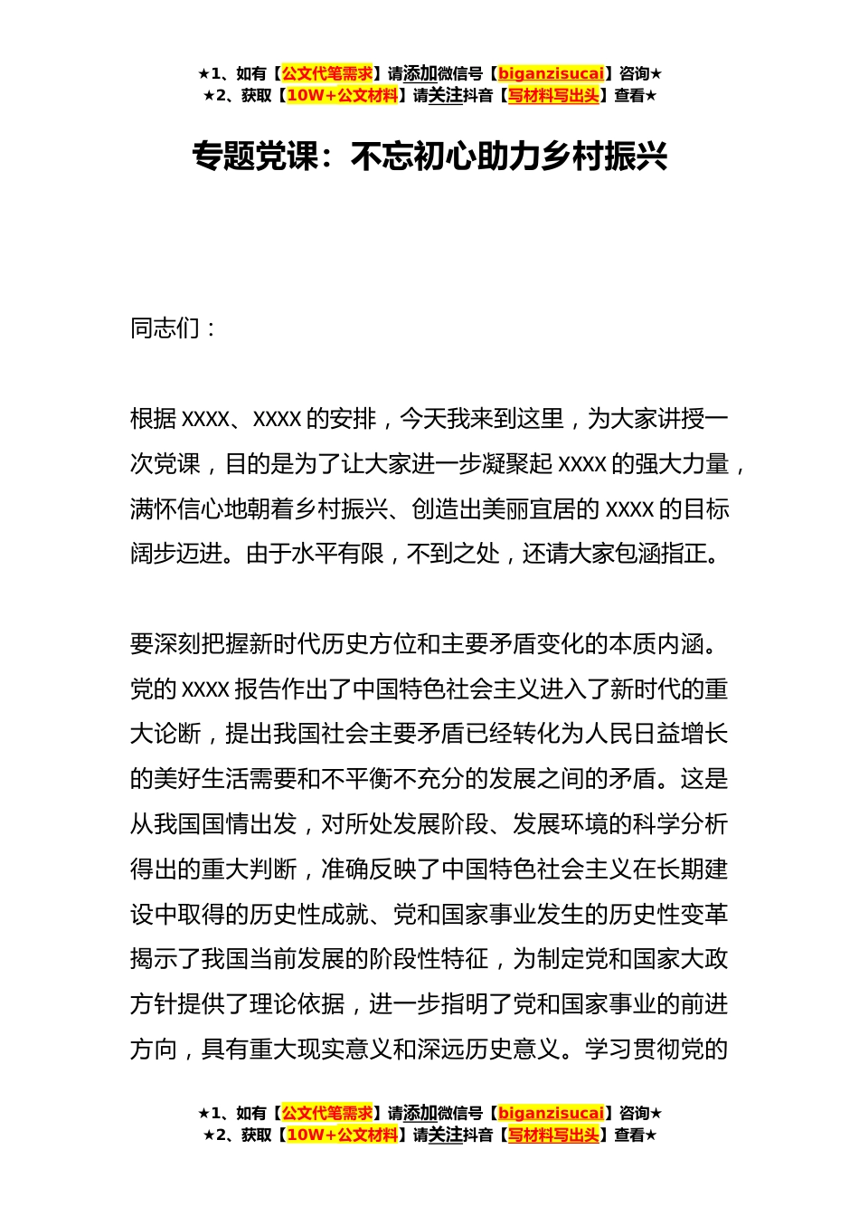 ★1、如有【公文代笔需求】请添加微信号【biganzisucai】咨询★★2、获取【10W+公文材料】请关注抖音【写材料写出头】查看★专题党课:不忘初心助力乡村振兴同志们:根据XXXX、XXXX的安排,今天我来到这里,为大家讲授一次党课,目的是为了让大家进一步凝聚起XXXX的强大力量,满怀信心地朝着乡村振兴、创造出美丽宜居的XXXX的目标阔步迈进。由于水平有限,不到之处,还请大家包涵指正。要深刻把握新时代历史方位和主要矛盾变化的本质内涵。党的XXXX报告作出了中国特色社会主义进入了新时代的重大论断,提出我国社会主要矛盾已经转化为人民日益增长的美好生活需要和不平衡不充分的发展之间的矛盾。这是从我国国情出发,对所处发展阶段、发展环境的科学分析得出的重大判断,准确反映了中国特色社会主义在长期建设中...