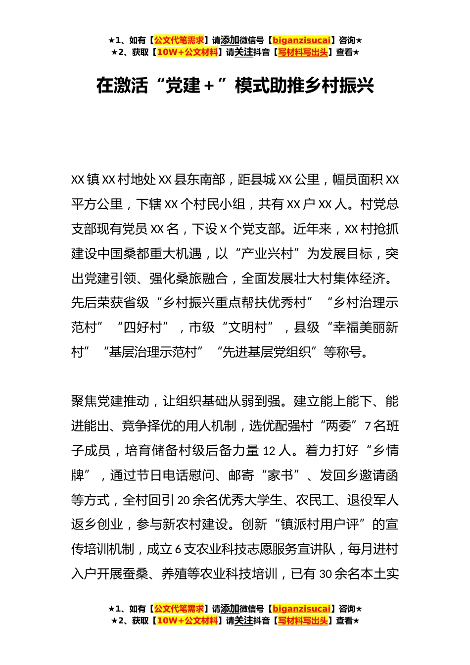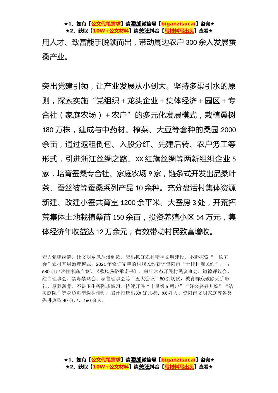 ★1、如有【公文代笔需求】请添加微信号【biganzisucai】咨询★★2、获取【10W+公文材料】请关注抖音【写材料写出头】查看★在激活“党建+”模式助推乡村振兴XX镇XX村地处XX县东南部,距县城XX公里,幅员面积XX平方公里,下辖XX个村民小组,共有XX户XX人。村党总支部现有党员XX名,下设X个党支部。近年来,XX村抢抓建设中国桑都重大机遇,以“产业兴村”为发展目标,突出党建引领、强化桑旅融合,全面发展壮大村集体经济。先后荣获省级“乡村振兴重点帮扶优秀村”“乡村治理示范村”“四好村”,市级“文明村”,县级“幸福美丽新村”“基层治理示范村”“先进基层党组织”等称号。聚焦党建推动,让组织基础从弱到强。建立能上能下、能进能出、竞争择优的用人机制,选优配强村“两委”7名班子成员,培育储备村级...