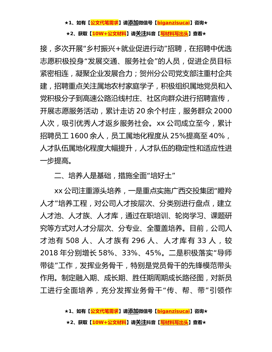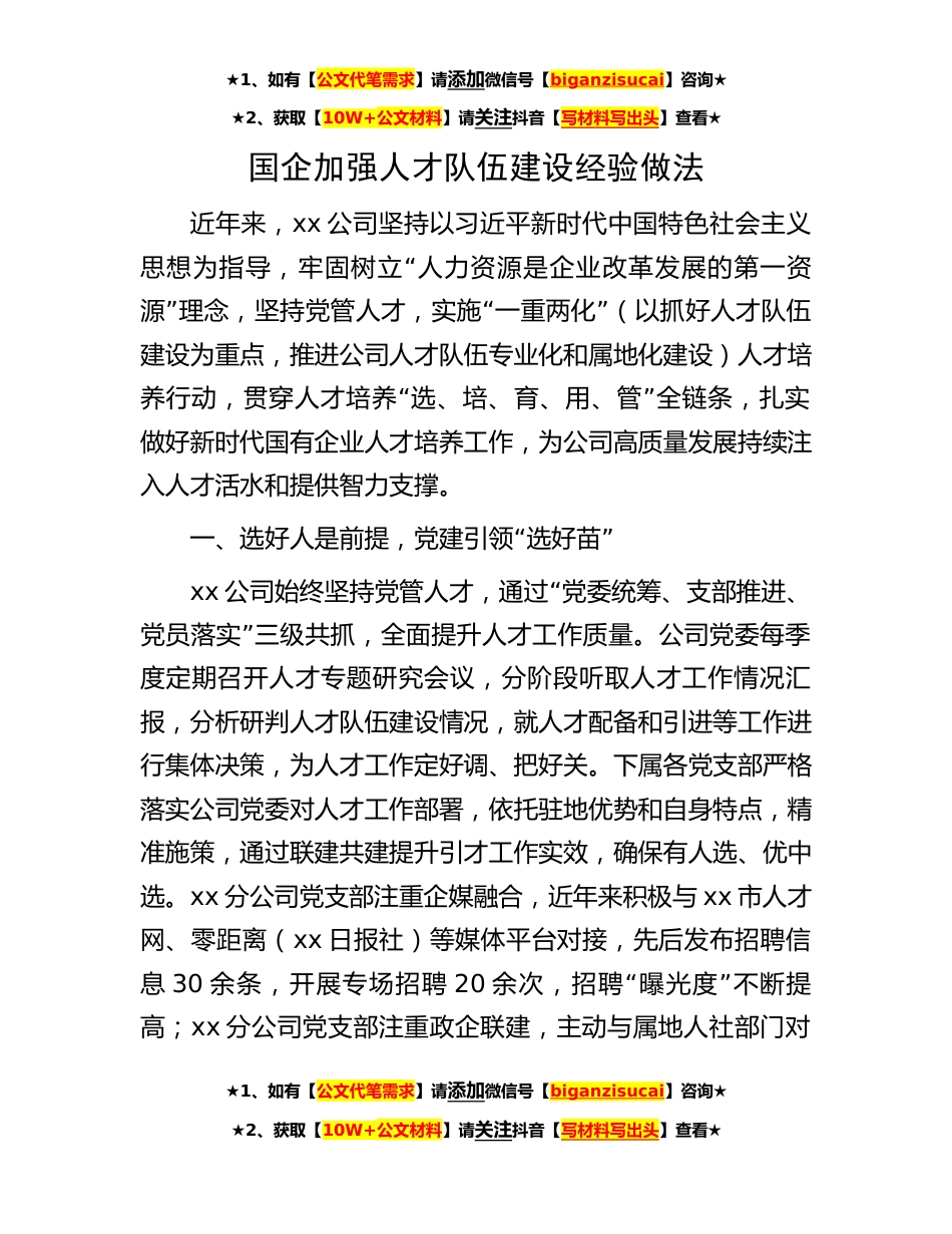 ★1、如有【公文代笔需求】请添加微信号【biganzisucai】咨询★★2、获取【10W+公文材料】请关注抖音【写材料写出头】查看★国企加强人才队伍建设经验做法近年来,xx公司坚持以习近平新时代中国特色社会主义“思想为指导,牢固树立人力资源是企业改革发展的第一资”“”源理念,坚持党管人才,实施一重两化(以抓好人才队伍建设为重点,推进公司人才队伍专业化和属地化建设)人才培“”养行动,贯穿人才培养选、培、育、用、管全链条,扎实做好新时代国有企业人才培养工作,为公司高质量发展持续注入人才活水和提供智力支撑。“”一、选好人是前提,党建引领选好苗xx“公司始终坚持党管人才,通过党委统筹、支部推进、”党员落实三级共抓,全面提升人才工作质量。公司党委每季度定期召开人才专题研究会议,分阶段...