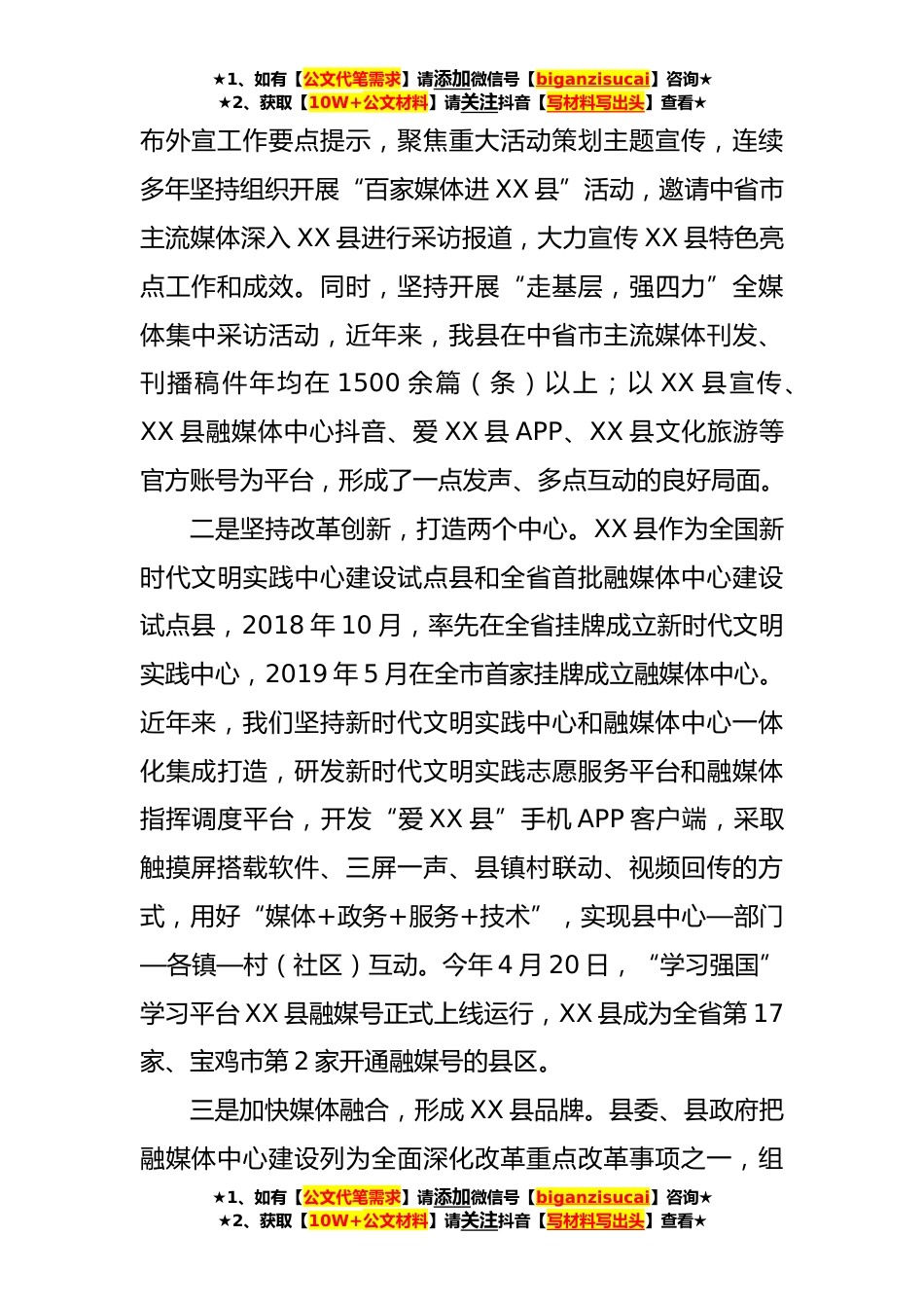 ★1、如有【公文代笔需求】请添加微信号【biganzisucai】咨询★★2、获取【10W+公文材料】请关注抖音【写材料写出头】查看★XX县开展“提高全媒体时代舆论引导能力”专题调研报告当前,世界正处于百年未有之大变局,我国正处在全面深化改革的关键时期,尤其是近年来随着经济社会、互联网和信息技术的迅猛发展,舆论生态、媒体格局、传播方式发生了深刻变化,全媒体时代的到来,给以报纸、广播、电视为代表的传统媒体带来了极大的冲击,同时也为基层宣传战线提升舆论引导能力带来了极大的挑战。一、党的十八大以来,舆论引导工作的经验做法和规律性认识十八大以来,XX县县委宣传部紧扣“举旗帜、聚民心、育新人、兴文化、展形象”五大使命,围绕正面宣传、载体品牌、媒体融合、队伍建设等方面重点发力,不断推动全...