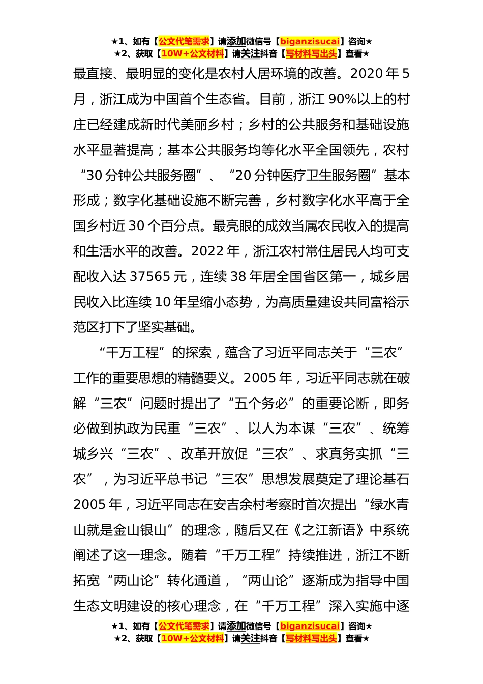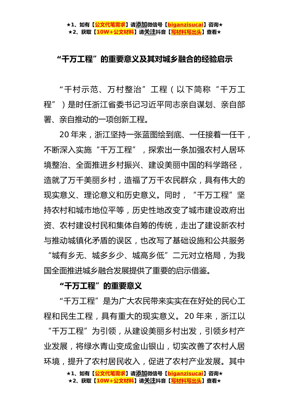 ★1、如有【公文代笔需求】请添加微信号【biganzisucai】咨询★★2、获取【10W+公文材料】请关注抖音【写材料写出头】查看★“千万工程”的重要意义及其对城乡融合的经验启示“千村示范、万村整治”工程(以下简称“千万工程”)是时任浙江省委书记习近平同志亲自谋划、亲自部署、亲自推动的一项创新工程。20年来,浙江坚持一张蓝图绘到底、一任接着一任干,不断深入实施“千万工程”,探索出一条加强农村人居环境整治、全面推进乡村振兴、建设美丽中国的科学路径,造就了万千美丽乡村,造福了万千农民群众,具有伟大的现实意义、理论意义和历史意义。同时,“千万工程”坚持农村和城市地位平等,历史性地改变了城市建设政府出资、农村建设村民和集体自筹的传统,走出了建设新农村与推动城镇化矛盾的误区,也改写...