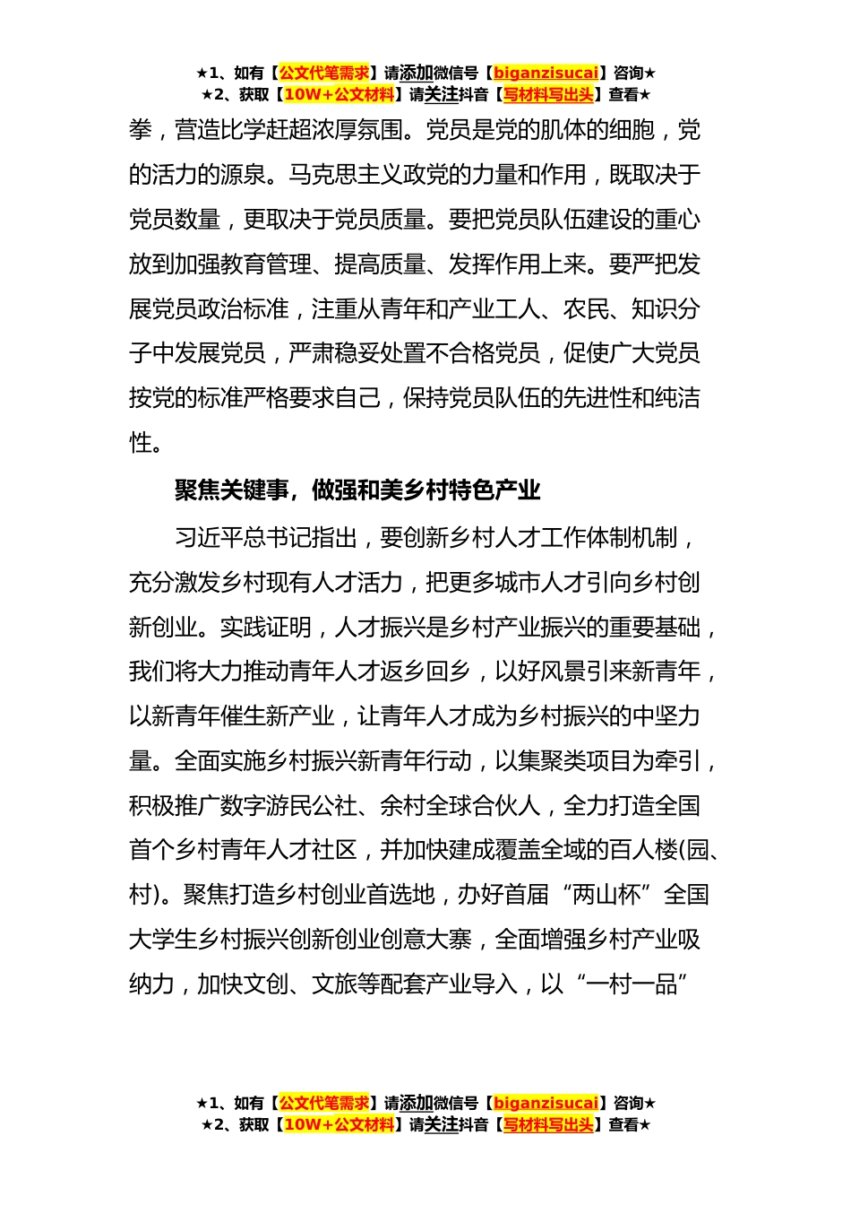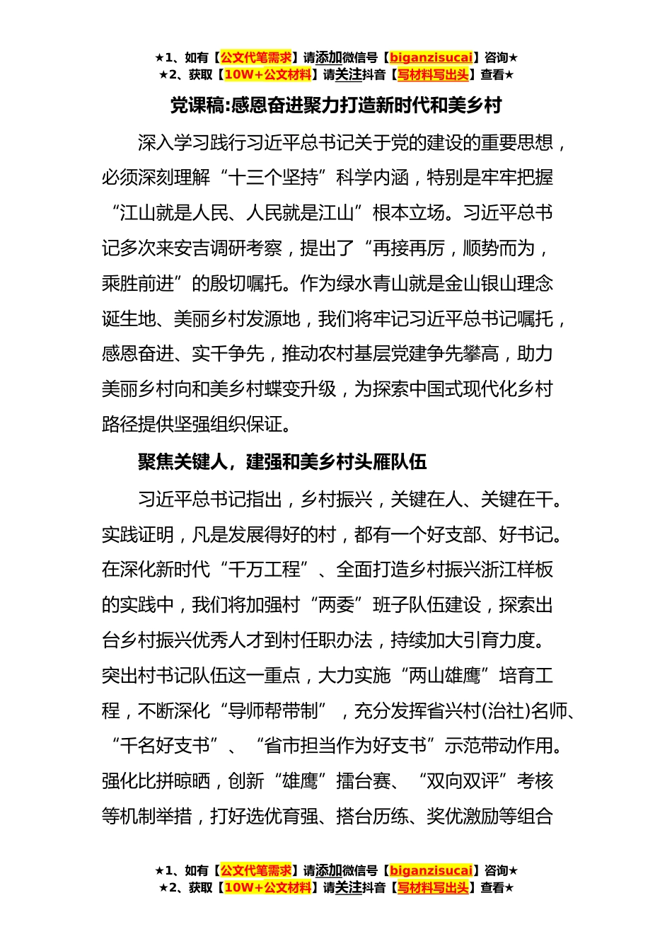 ★1、如有【公文代笔需求】请添加微信号【biganzisucai】咨询★★2、获取【10W+公文材料】请关注抖音【写材料写出头】查看★党课稿:感恩奋进聚力打造新时代和美乡村深入学习践行习近平总书记关于党的建设的重要思想,必须深刻理解“十三个坚持”科学内涵,特别是牢牢把握“江山就是人民、人民就是江山”根本立场。习近平总书记多次来安吉调研考察,提出了“再接再厉,顺势而为,乘胜前进”的殷切嘱托。作为绿水青山就是金山银山理念诞生地、美丽乡村发源地,我们将牢记习近平总书记嘱托,感恩奋进、实千争先,推动农村基层党建争先攀高,助力美丽乡村向和美乡村蝶变升级,为探索中国式现代化乡村路径提供坚强组织保证。聚焦关键人,建强和美乡村头雁队伍习近平总书记指出,乡村振兴,关键在人、关键在干。实践证明...
