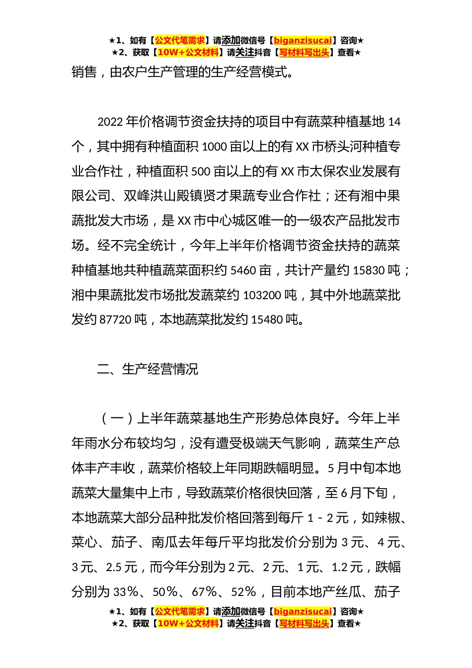 ★1、如有【公文代笔需求】请添加微信号【biganzisucai】咨询★★2、获取【10W+公文材料】请关注抖音【写材料写出头】查看★关于2023年全市蔬菜生产经营和应对高温天气情况的调研报告蔬菜价格一头连着农民,一头连着市民,既是大量农民就业、增收的重要手段,又直接关系到城乡居民的日常生活,为保障蔬菜的市场供应和价格基本稳定,根据委领导的安排,7月初市发改委价格监测中心就蔬菜基地、农贸市场的生产经营和应对高温天气情况开展专题调研,重点走访了我市价格调节资金扶持的蔬菜基地、种养殖基地。现将有关情况汇报如下:一、基本情况据农业农村局统计,上半年全市蔬菜种植面积30.4万亩,同比增加2.3%;总产64.1万吨,同比增加3.5%。我市蔬菜种植基地大多是采取“公司+农户”或“公司+基地+农户”,基地...