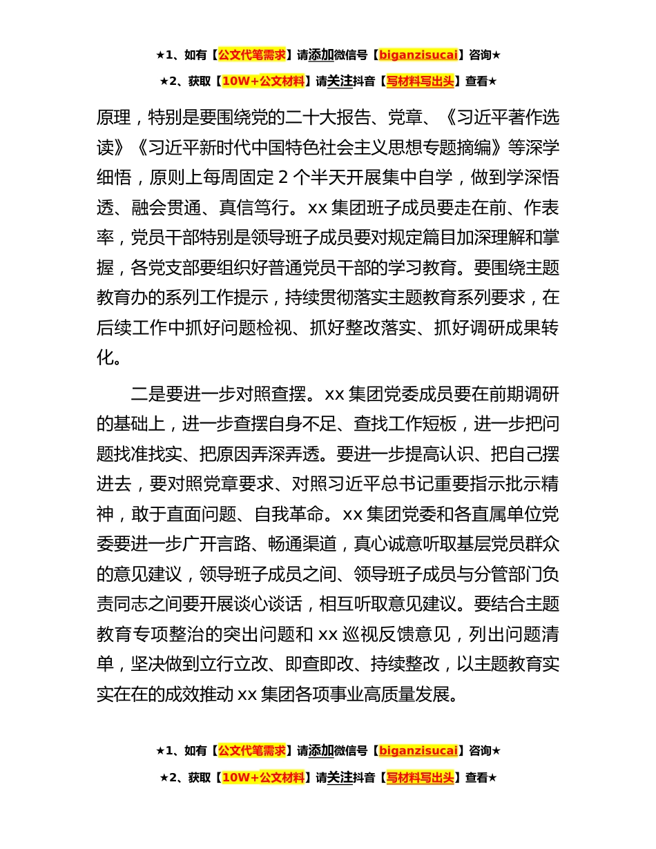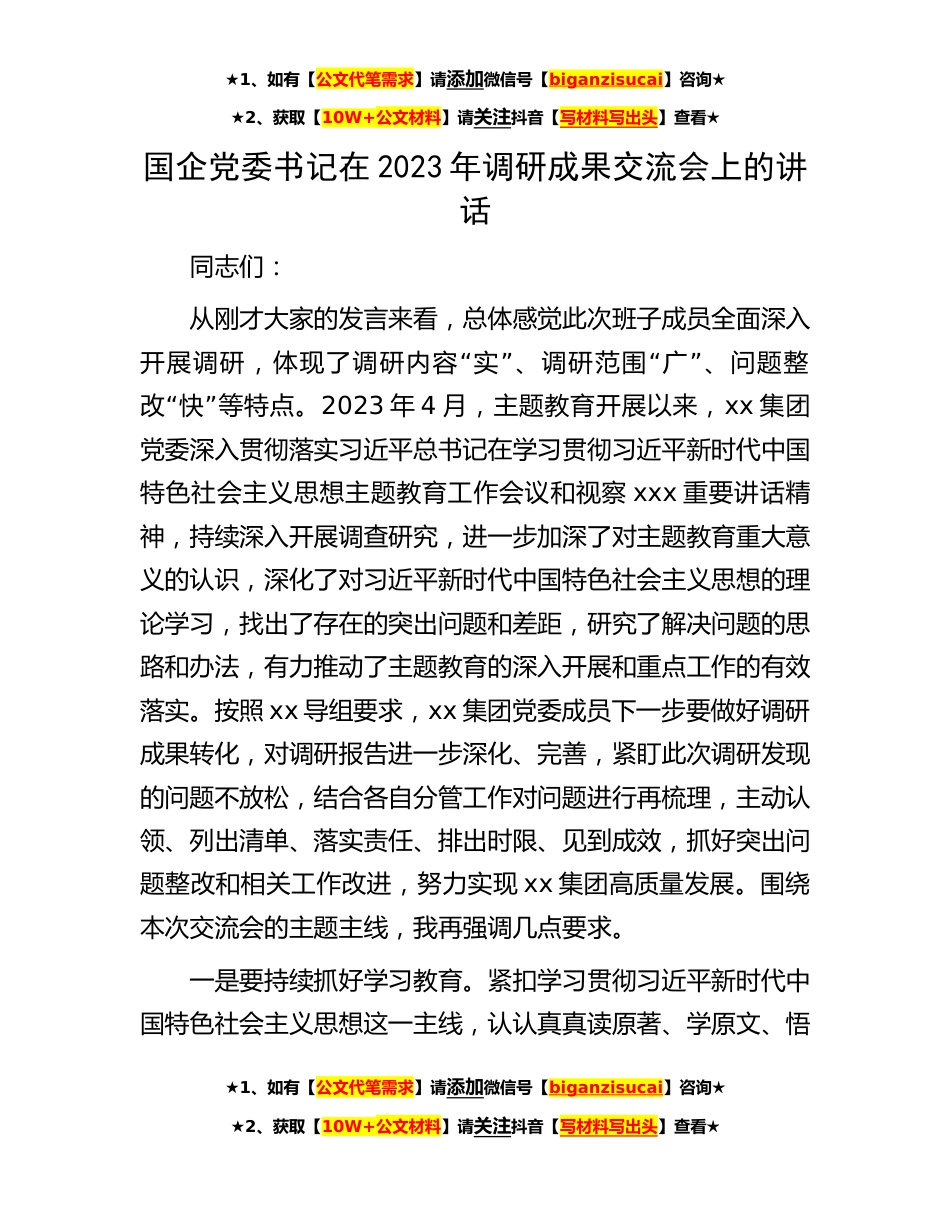 ★1、如有【公文代笔需求】请添加微信号【biganzisucai】咨询★★2、获取【10W+公文材料】请关注抖音【写材料写出头】查看★国企党委书记在2023年调研成果交流会上的讲话同志们:从刚才大家的发言来看,总体感觉此次班子成员全面深入“”“”开展调研,体现了调研内容实、调研范围广、问题整“”改快等特点。2023年4月,主题教育开展以来,xx集团党委深入贯彻落实习近平总书记在学习贯彻习近平新时代中国特色社会主义思想主题教育工作会议和视察xxx重要讲话精神,持续深入开展调查研究,进一步加深了对主题教育重大意义的认识,深化了对习近平新时代中国特色社会主义思想的理论学习,找出了存在的突出问题和差距,研究了解决问题的思路和办法,有力推动了主题教育的深入开展和重点工作的有效落实。按照xx导组要求...