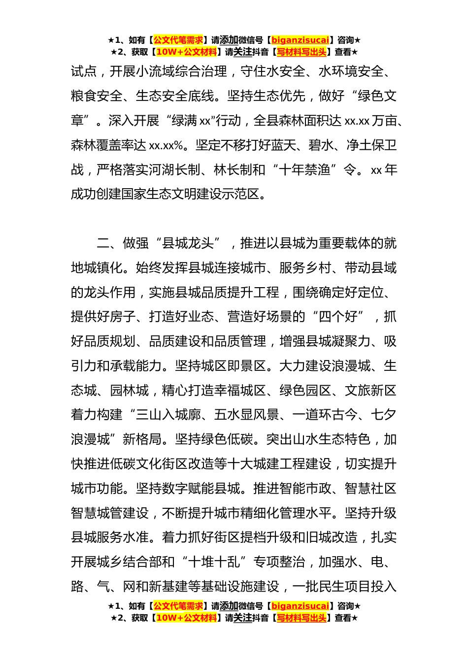 ★1、如有【公文代笔需求】请添加微信号【biganzisucai】咨询★★2、获取【10W+公文材料】请关注抖音【写材料写出头】查看★XX县强县工程、乡村振兴工作汇报尊敬的xx书记、xx市长,各位领导,同志们:省第十二次党代会明确要求“以强县工程为抓手,全面推进乡村振兴”。这是xx建设全国构建新发展格局先行区的必然要求和重要支撑,是推进全省农业农村现代化的战略举措。近年来,我们认真践行A新时代中国特色社会主义思想,坚持系统的观念和统筹的方法,立足南水北调中线工程水源保护核心区的特殊县情,围绕做好山、水、车、农民增收致富“四篇文章”,积极探索强县工程实施路径,全面推进乡村振兴。根据会议安排,现将有关工作进展情况汇报如下:一、做深“流域综合治理”,推进四化同步发展。编制《xx县流域综合治...