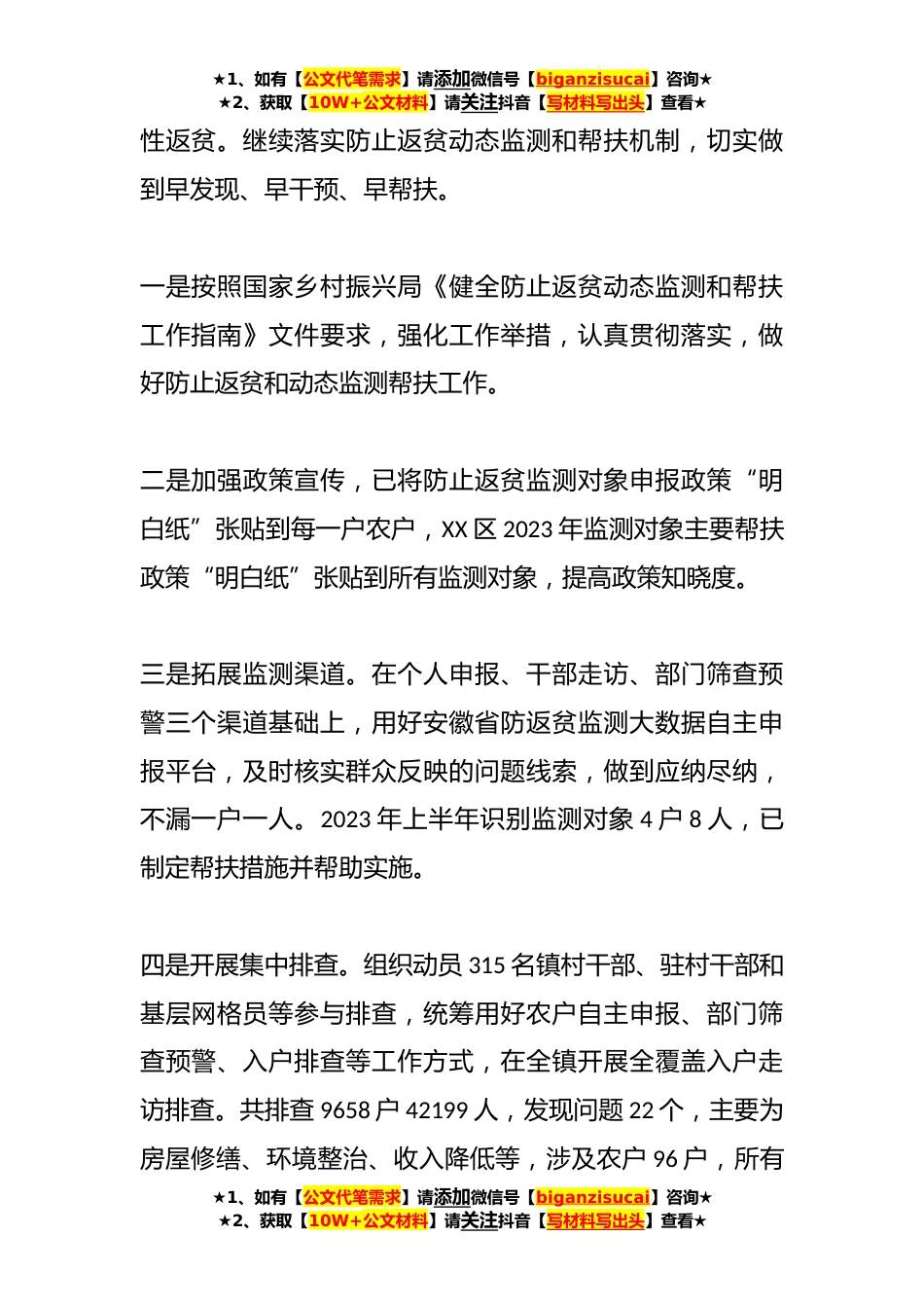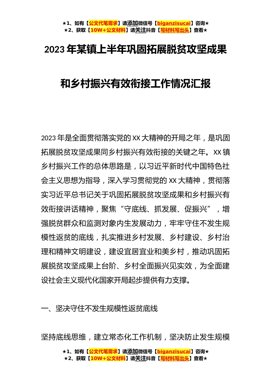 ★1、如有【公文代笔需求】请添加微信号【biganzisucai】咨询★★2、获取【10W+公文材料】请关注抖音【写材料写出头】查看★2023年某镇上半年巩固拓展脱贫攻坚成果和乡村振兴有效衔接工作情况汇报2023年是全面贯彻落实党的XX大精神的开局之年,是巩固拓展脱贫攻坚成果同乡村振兴有效衔接的关键之年。XX镇乡村振兴工作的总体思路是,以习近平新时代中国特色社会主义思想为指导,深入学习贯彻党的XX大精神,贯彻落实习近平总书记关于巩固拓展脱贫攻坚成果和乡村振兴有效衔接讲话精神,聚焦“守底线、抓发展、促振兴”,增强脱贫群众和监测对象内生发展动力,牢牢守住不发生规模性返贫的底线,扎实推进乡村发展、乡村建设、乡村治理和精神文明建设,建设宜居宜业和美乡村,推动巩固拓展脱贫攻坚成果上台阶、乡村全面...