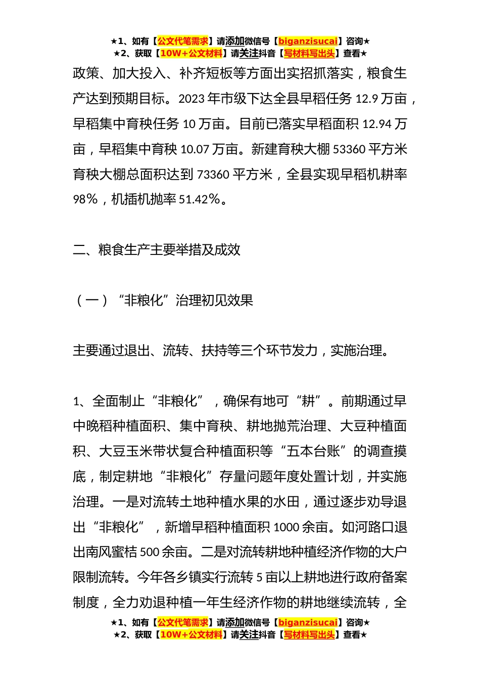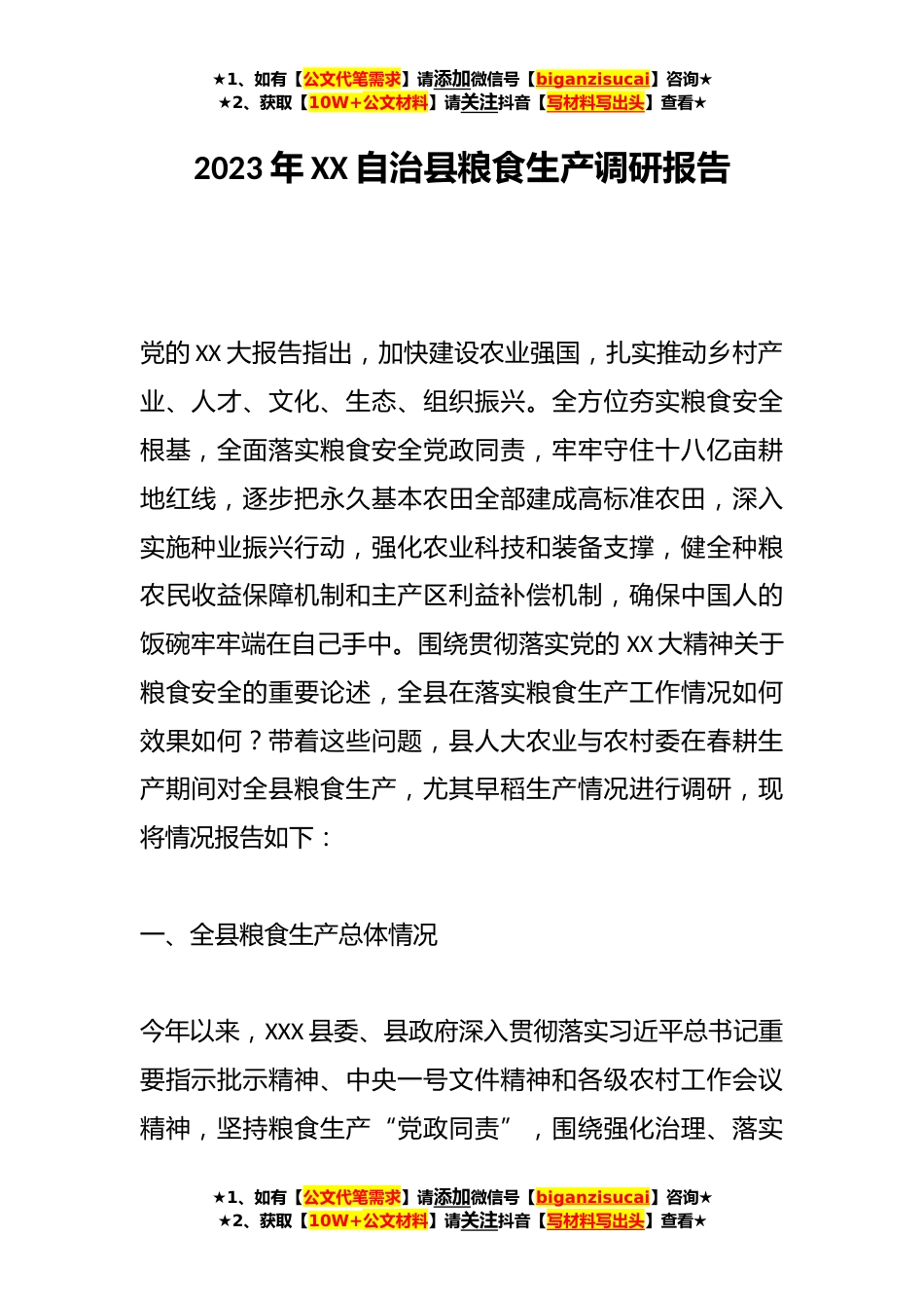★1、如有【公文代笔需求】请添加微信号【biganzisucai】咨询★★2、获取【10W+公文材料】请关注抖音【写材料写出头】查看★2023年XX自治县粮食生产调研报告党的XX大报告指出,加快建设农业强国,扎实推动乡村产业、人才、文化、生态、组织振兴。全方位夯实粮食安全根基,全面落实粮食安全党政同责,牢牢守住十八亿亩耕地红线,逐步把永久基本农田全部建成高标准农田,深入实施种业振兴行动,强化农业科技和装备支撑,健全种粮农民收益保障机制和主产区利益补偿机制,确保中国人的饭碗牢牢端在自己手中。围绕贯彻落实党的XX大精神关于粮食安全的重要论述,全县在落实粮食生产工作情况如何效果如何?带着这些问题,县人大农业与农村委在春耕生产期间对全县粮食生产,尤其早稻生产情况进行调研,现将情况报告如下:...