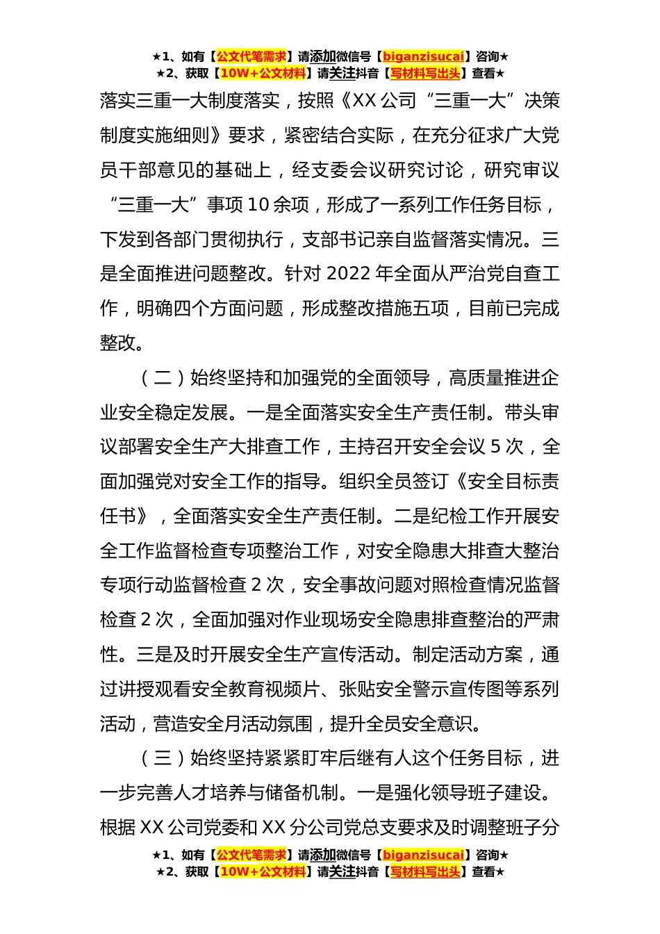 ★1、如有【公文代笔需求】请添加微信号【biganzisucai】咨询★★2、获取【10W+公文材料】请关注抖音【写材料写出头】查看★国企党支部2023年落实全面从严治党(党建)责任年中自查报告(6027字)2023年以来XX公司党支部全面贯彻落实习近平新时代中国特色社会主义思想和党的二十大精神,坚持党建工作与生产经营中心工作同谋划、同部署、同推进、同考核,以健全全面从严治党体系为重要抓手,不断推进主体责任落地见效。一、组织落实情况按照XX公司《关于开展2023年落实全面从严治党(党建)责任年中自查自评的通知》要求,XX公司党支部认真贯彻落实文件要求,由综合办公室牵头对照清单开展了自查自评工作,现将上半年全面从严治党(党建)责任自查开展情况汇报如下:(一)始终坚持以政治建设为统领,落实落细从严治...