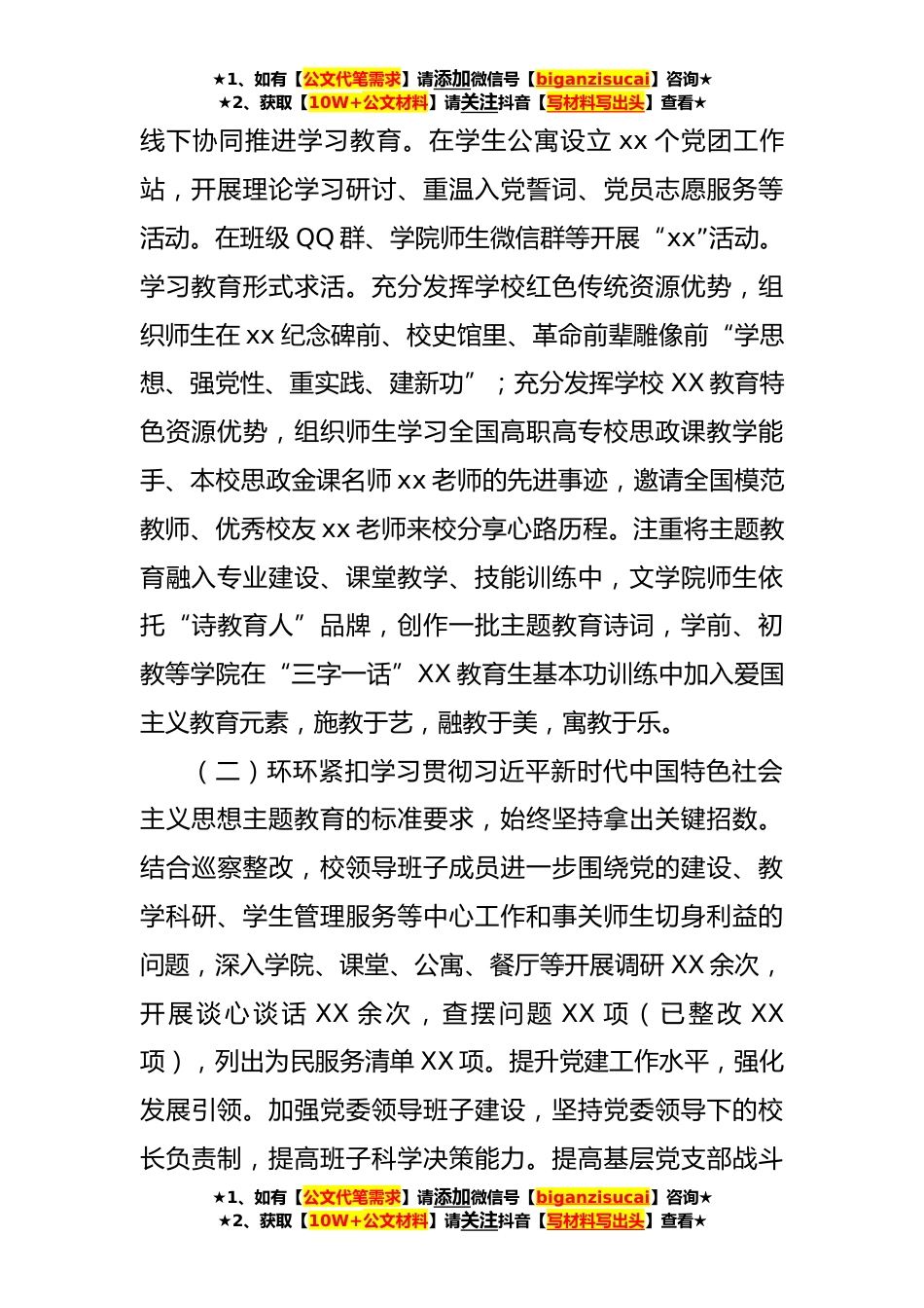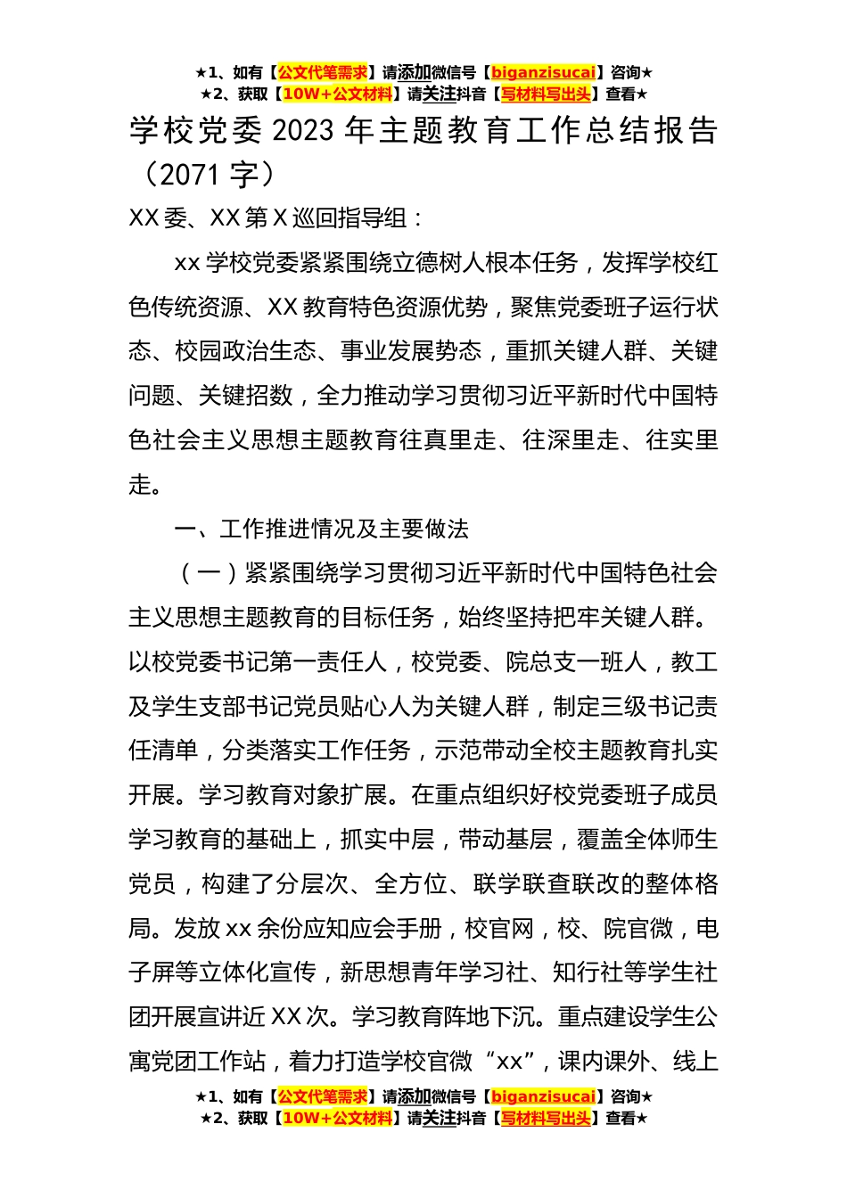 ★1、如有【公文代笔需求】请添加微信号【biganzisucai】咨询★★2、获取【10W+公文材料】请关注抖音【写材料写出头】查看★学校党委2023年主题教育工作总结报告(2071字)XX委、XX第X巡回指导组:xx学校党委紧紧围绕立德树人根本任务,发挥学校红色传统资源、XX教育特色资源优势,聚焦党委班子运行状态、校园政治生态、事业发展势态,重抓关键人群、关键问题、关键招数,全力推动学习贯彻习近平新时代中国特色社会主义思想主题教育往真里走、往深里走、往实里走。一、工作推进情况及主要做法(一)紧紧围绕学习贯彻习近平新时代中国特色社会主义思想主题教育的目标任务,始终坚持把牢关键人群。以校党委书记第一责任人,校党委、院总支一班人,教工及学生支部书记党员贴心人为关键人群,制定三级书记责任清单,分...