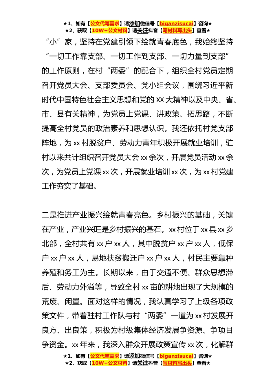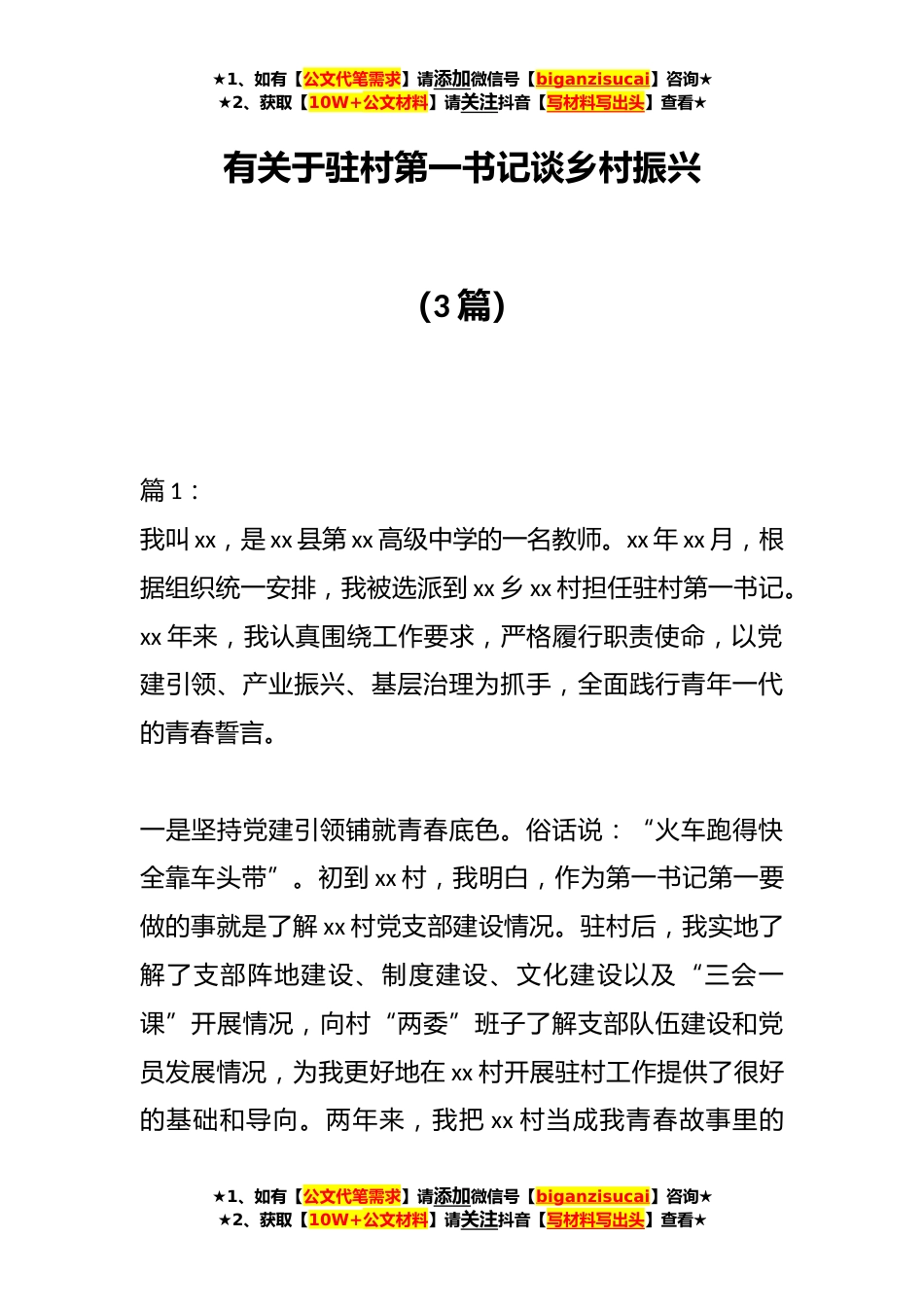 ★1、如有【公文代笔需求】请添加微信号【biganzisucai】咨询★★2、获取【10W+公文材料】请关注抖音【写材料写出头】查看★有关于驻村第一书记谈乡村振兴(3篇)篇1:我叫xx,是xx县第xx高级中学的一名教师。xx年xx月,根据组织统一安排,我被选派到xx乡xx村担任驻村第一书记。xx年来,我认真围绕工作要求,严格履行职责使命,以党建引领、产业振兴、基层治理为抓手,全面践行青年一代的青春誓言。一是坚持党建引领铺就青春底色。俗话说:“火车跑得快全靠车头带”。初到xx村,我明白,作为第一书记第一要做的事就是了解xx村党支部建设情况。驻村后,我实地了解了支部阵地建设、制度建设、文化建设以及“三会一课”开展情况,向村“两委”班子了解支部队伍建设和党员发展情况,为我更好地在xx村开展驻村工作提供...