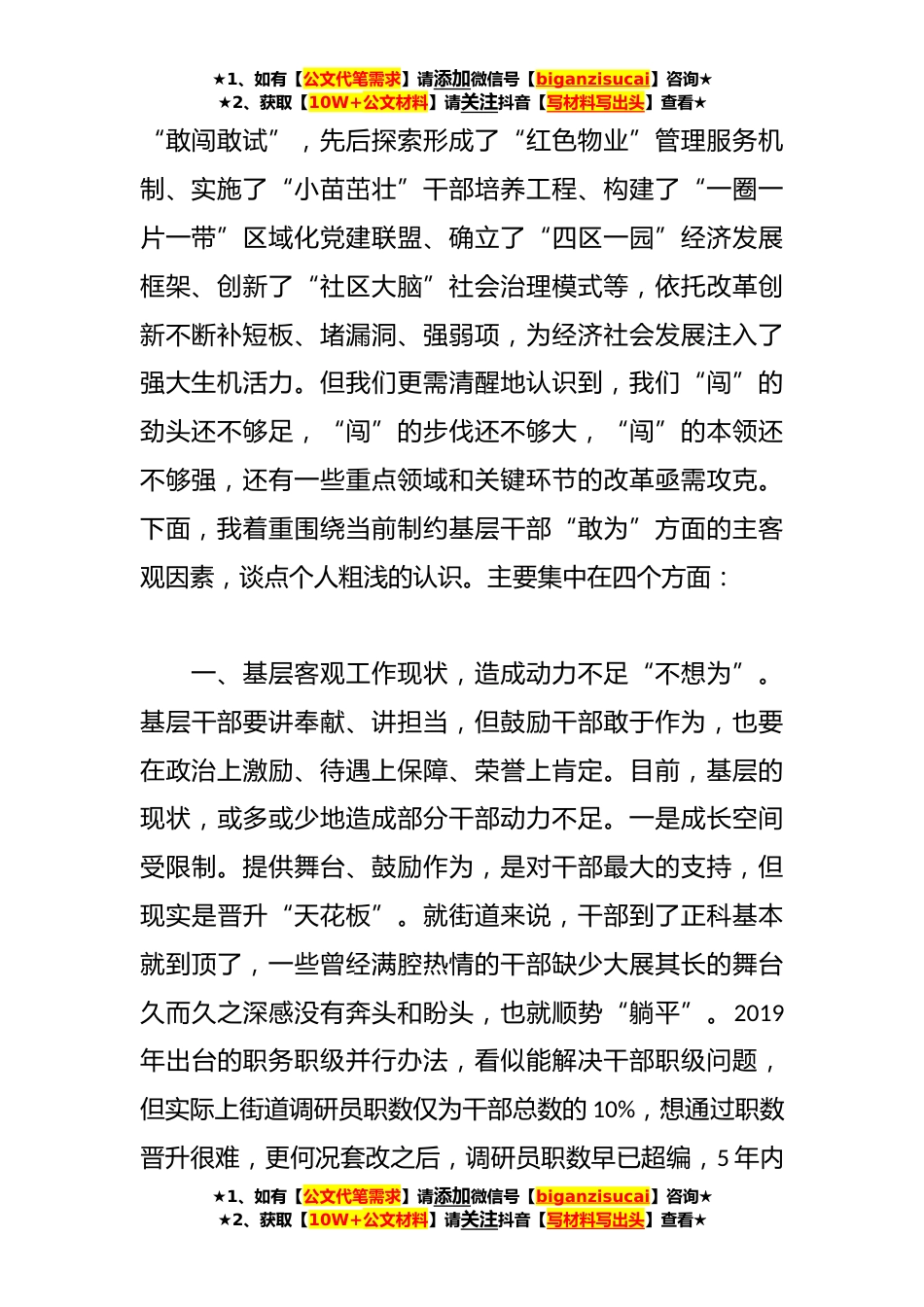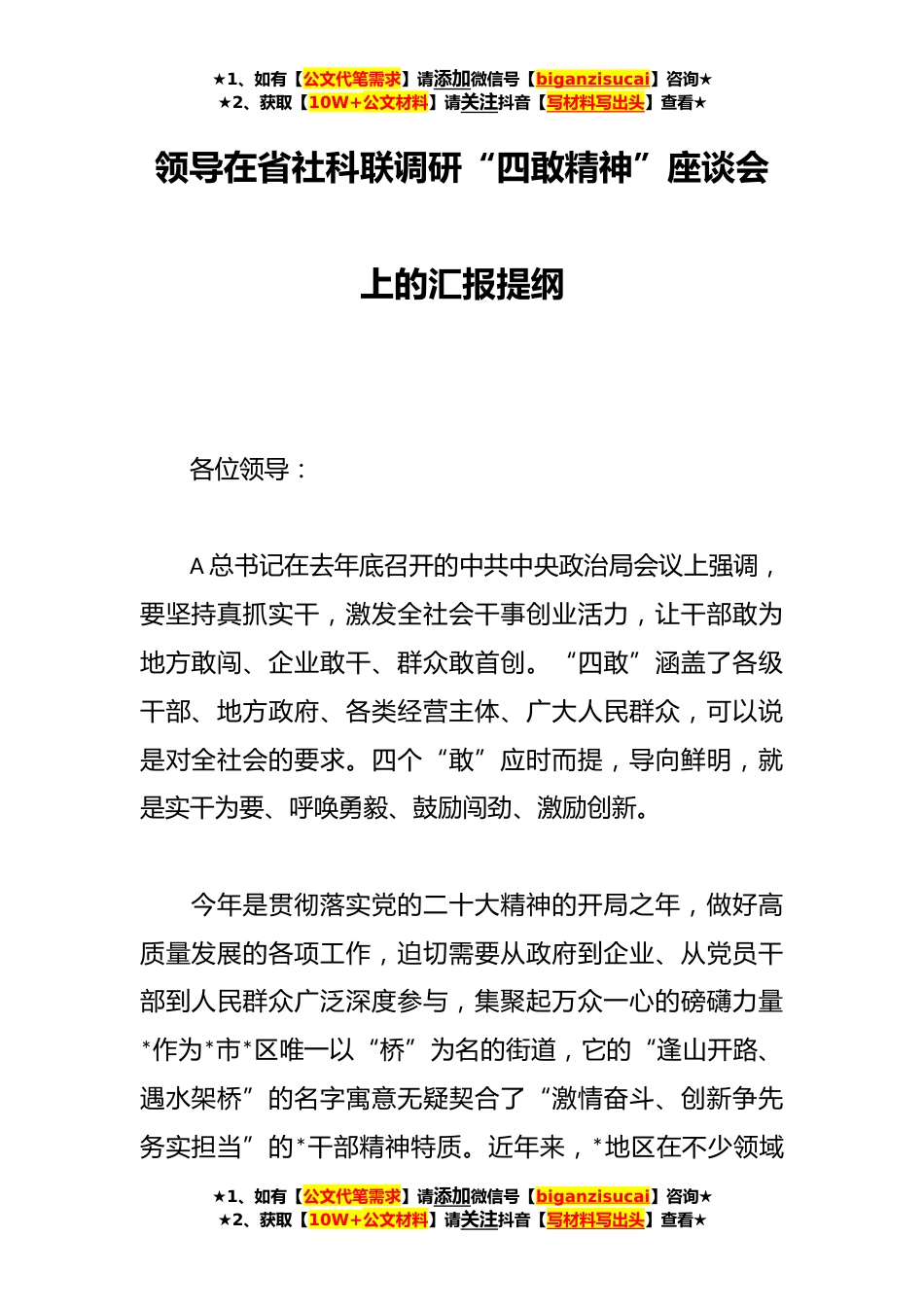 ★1、如有【公文代笔需求】请添加微信号【biganzisucai】咨询★★2、获取【10W+公文材料】请关注抖音【写材料写出头】查看★领导在省社科联调研“四敢精神”座谈会上的汇报提纲各位领导:A总书记在去年底召开的中共中央政治局会议上强调,要坚持真抓实干,激发全社会干事创业活力,让干部敢为地方敢闯、企业敢干、群众敢首创。“四敢”涵盖了各级干部、地方政府、各类经营主体、广大人民群众,可以说是对全社会的要求。四个“敢”应时而提,导向鲜明,就是实干为要、呼唤勇毅、鼓励闯劲、激励创新。今年是贯彻落实党的二十大精神的开局之年,做好高质量发展的各项工作,迫切需要从政府到企业、从党员干部到人民群众广泛深度参与,集聚起万众一心的磅礴力量*作为*市*区唯一以“桥”为名的街道,它的“逢山开路、遇...