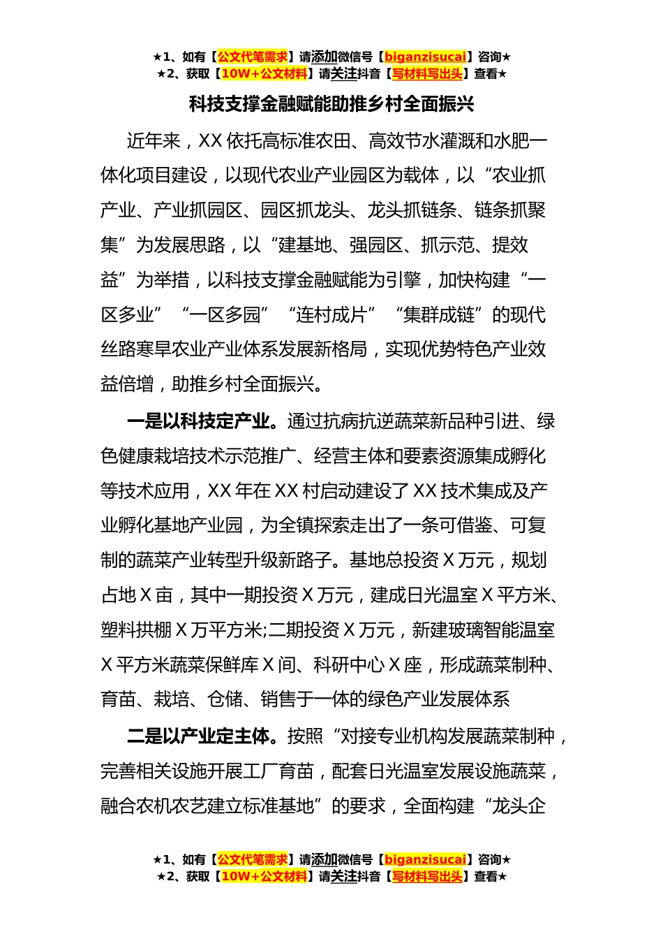★1、如有【公文代笔需求】请添加微信号【biganzisucai】咨询★★2、获取【10W+公文材料】请关注抖音【写材料写出头】查看★科技支撑金融赋能助推乡村全面振兴近年来,XX依托高标准农田、高效节水灌溉和水肥一体化项目建设,以现代农业产业园区为载体,以“农业抓产业、产业抓园区、园区抓龙头、龙头抓链条、链条抓聚集”为发展思路,以“建基地、强园区、抓示范、提效益”为举措,以科技支撑金融赋能为引擎,加快构建“一区多业”“一区多园”“连村成片”“集群成链”的现代丝路寒旱农业产业体系发展新格局,实现优势特色产业效益倍增,助推乡村全面振兴。一是以科技定产业。通过抗病抗逆蔬菜新品种引进、绿色健康栽培技术示范推广、经营主体和要素资源集成孵化等技术应用,XX年在XX村启动建设了XX技术集成及产...