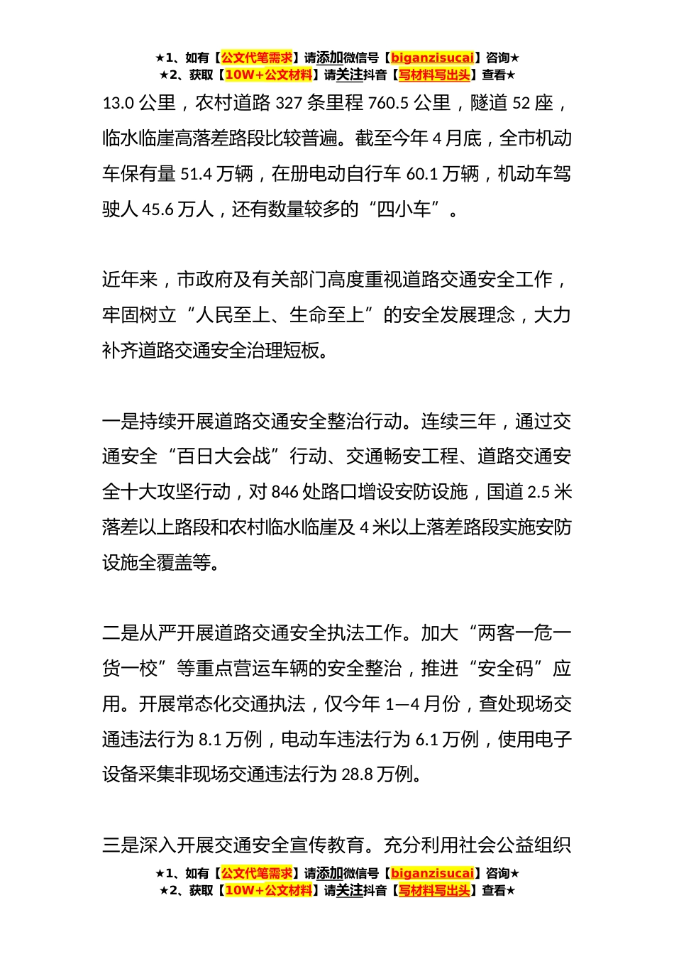 ★1、如有【公文代笔需求】请添加微信号【biganzisucai】咨询★★2、获取【10W+公文材料】请关注抖音【写材料写出头】查看★某市关于道路交通安全工作情况的调研报告主任、副主任,各位委员:根据市人大常委会2023年监督工作计划的安排,从4月初开始,市人大常委会副主任XXX带领由部分市人大常委会委员、人大代表、社会建设专(工)委全体人员组成的调研组,对我市道路交通安全工作情况进行了调研。期间,走访了市公安局交警大队、机动车驾驶员理论培训中心以及多个道路交通安全隐患点,并与相关部门和乡镇(街道)负责人进行了座谈交流。现将有关情况报告如下:一、基本情况我市境内现有国道2条里程118.2公里,县道25条里程317.8公里,乡道23条里程146.7公里,专用公路2条里程★1、如有【公文代笔需求】请添加微...