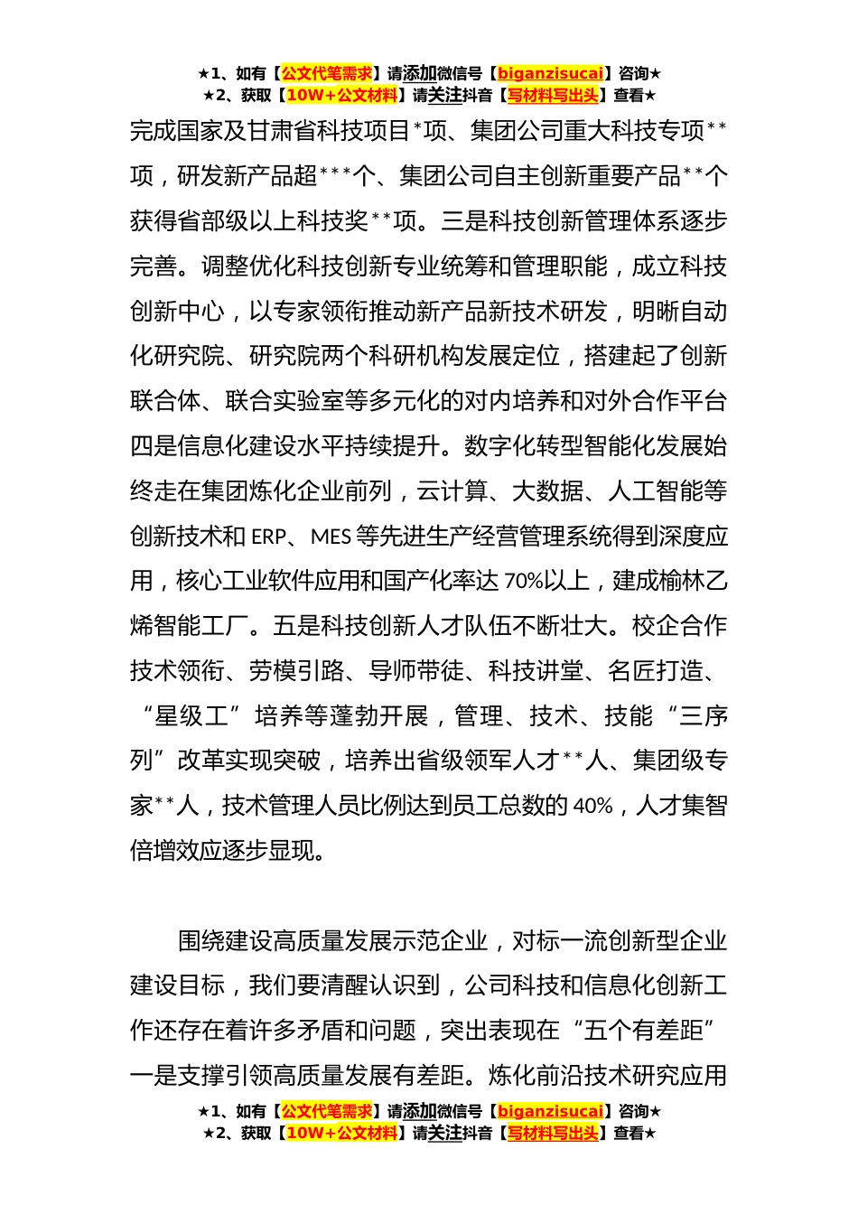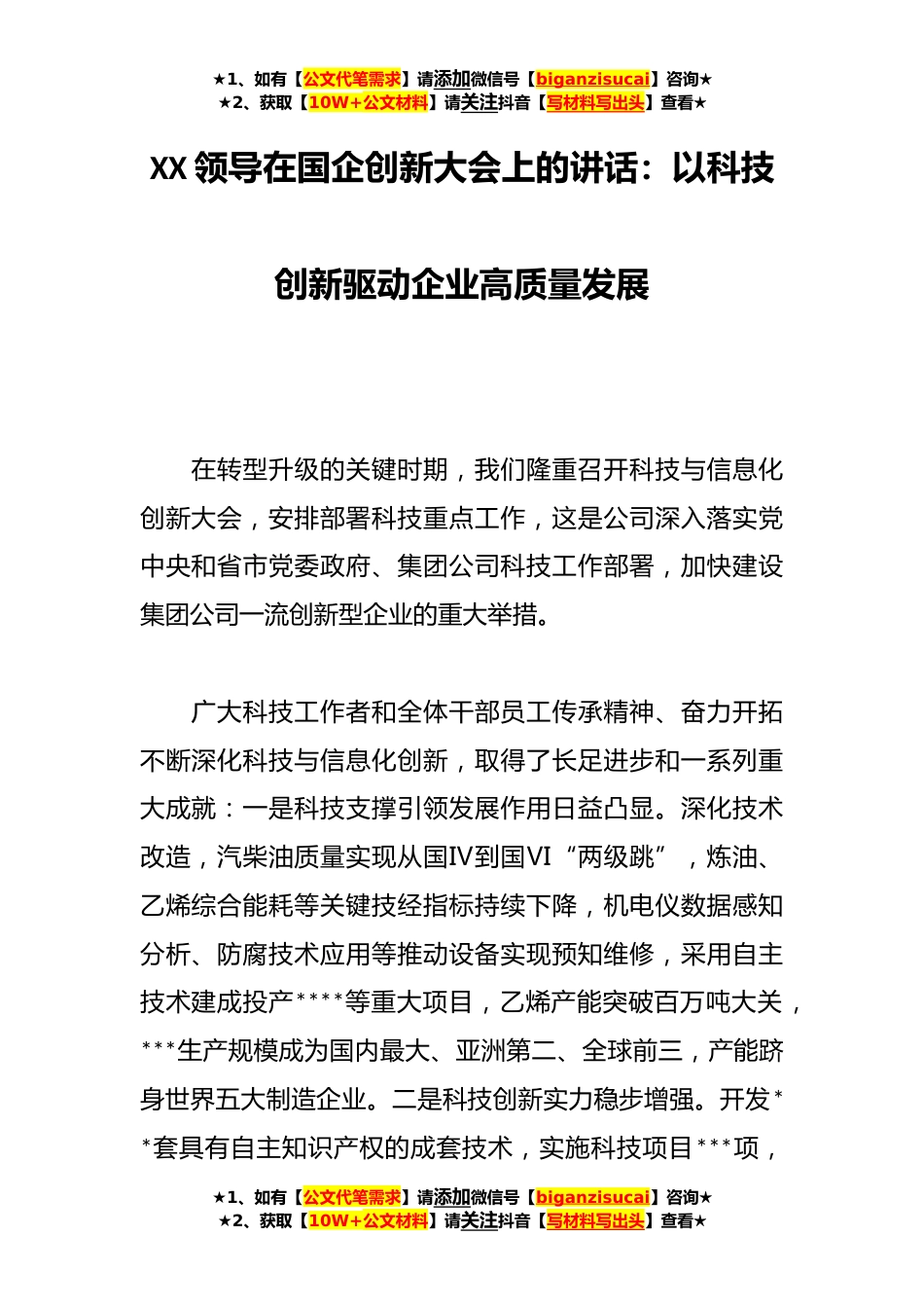 ★1、如有【公文代笔需求】请添加微信号【biganzisucai】咨询★★2、获取【10W+公文材料】请关注抖音【写材料写出头】查看★XX领导在国企创新大会上的讲话:以科技创新驱动企业高质量发展在转型升级的关键时期,我们隆重召开科技与信息化创新大会,安排部署科技重点工作,这是公司深入落实党中央和省市党委政府、集团公司科技工作部署,加快建设集团公司一流创新型企业的重大举措。广大科技工作者和全体干部员工传承精神、奋力开拓不断深化科技与信息化创新,取得了长足进步和一系列重大成就:一是科技支撑引领发展作用日益凸显。深化技术改造,汽柴油质量实现从国Ⅳ到国Ⅵ“两级跳”,炼油、乙烯综合能耗等关键技经指标持续下降,机电仪数据感知分析、防腐技术应用等推动设备实现预知维修,采用自主技术建成投产*...