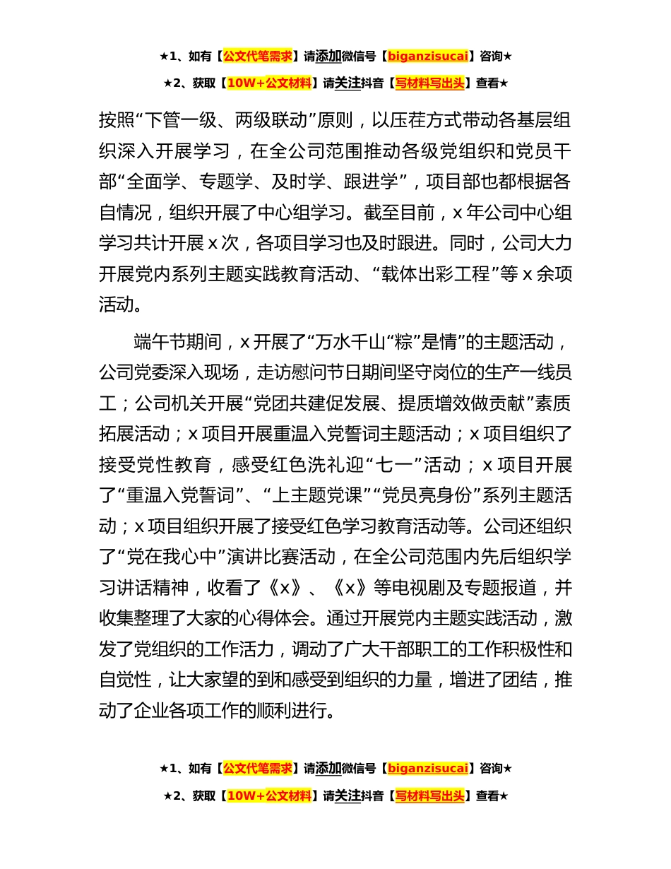 ★1、如有【公文代笔需求】请添加微信号【biganzisucai】咨询★★2、获取【10W+公文材料】请关注抖音【写材料写出头】查看★公司党建工作经验汇报材料:积极探索“望闻问切”的党建工作新路径x自成立以来,在x“公司党委的正确领导下,以x”个性化文化体系为指引,注重加强和改进党建工作的方式方法,党的组织建设和精神文明建设得到进一步加强,实现了生产经营和职工队伍的稳定,促进公司管理稳步向前发展。公司现有x名党员,在岗党员x名,离退休党员x名,其他党员x名。公司党委下设x个党工委、x个党支部,配备专职书记x名、专职副书记x名,兼职书记x名。公司认真分析研判面临的形势和任务,积极响应x公司党“”“”委三变、三转新要求,以基层党组织建设工作制度为指“”引,紧紧围绕生产经营中心任务,积极探索...