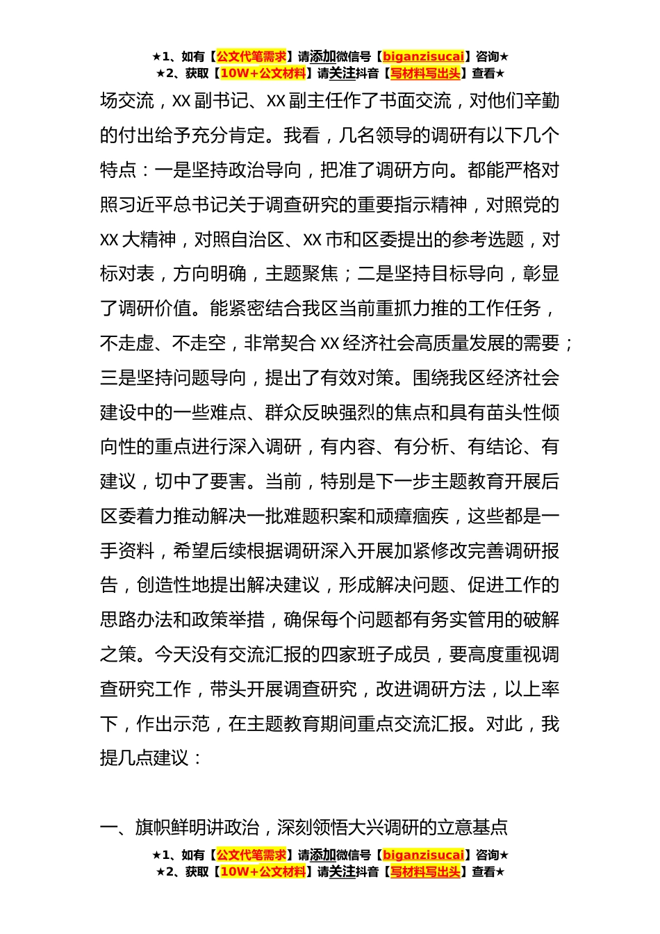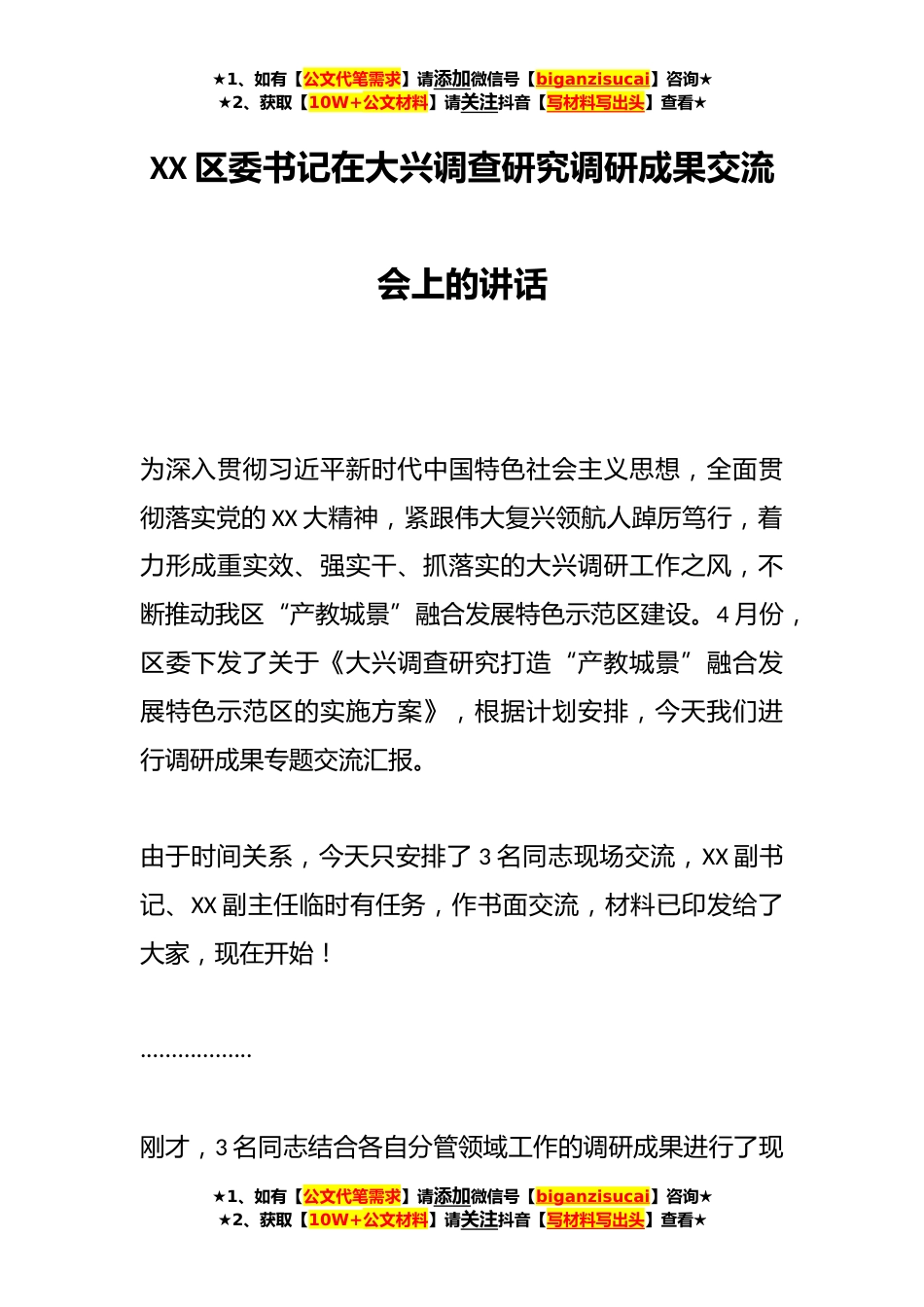 ★1、如有【公文代笔需求】请添加微信号【biganzisucai】咨询★★2、获取【10W+公文材料】请关注抖音【写材料写出头】查看★XX区委书记在大兴调查研究调研成果交流会上的讲话为深入贯彻习近平新时代中国特色社会主义思想,全面贯彻落实党的XX大精神,紧跟伟大复兴领航人踔厉笃行,着力形成重实效、强实干、抓落实的大兴调研工作之风,不断推动我区“产教城景”融合发展特色示范区建设。4月份,区委下发了关于《大兴调查研究打造“产教城景”融合发展特色示范区的实施方案》,根据计划安排,今天我们进行调研成果专题交流汇报。由于时间关系,今天只安排了3名同志现场交流,XX副书记、XX副主任临时有任务,作书面交流,材料已印发给了大家,现在开始!..................刚才,3名同志结合各自分管领域工作的调研成...