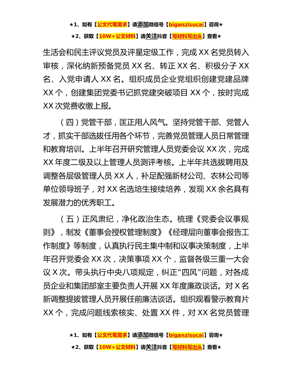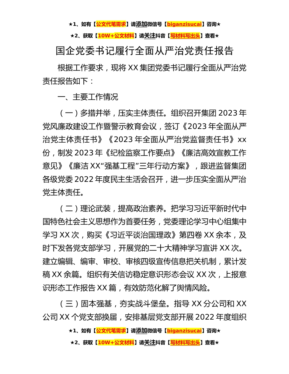 ★1、如有【公文代笔需求】请添加微信号【biganzisucai】咨询★★2、获取【10W+公文材料】请关注抖音【写材料写出头】查看★国企党委书记履行全面从严治党责任报告根据工作要求,现将XX集团党委书记履行全面从严治党责任报告如下:一、主要工作情况(一)多措并举,压实主体责任。组织召开集团2023年党风廉政建设工作暨警示教育会议,签订《2023年全面从严治党主体责任书》《2023年全面从严治党监督责任书》xx份,制发2023年《纪检监察工作要点》《廉洁高效宣教工作意见》《廉洁XX“”强基工程三年行动方案》,跟进监督集团各级党委2022年度民主生活会召开,进一步压实全面从严治党主体责任。(二)理论武装,提高政治素养。把学习习近平新时代中国特色社会主义思想作为首要任务,党委理论学习中心组集中学习XX次...