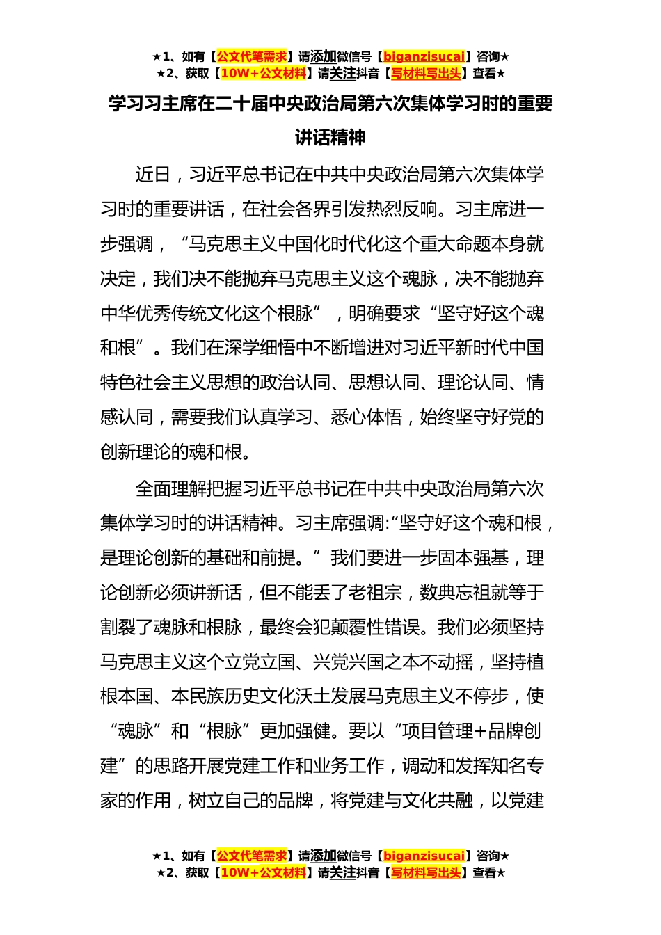 ★1、如有【公文代笔需求】请添加微信号【biganzisucai】咨询★★2、获取【10W+公文材料】请关注抖音【写材料写出头】查看★学习习主席在二十届中央政治局第六次集体学习时的重要讲话精神近日,习近平总书记在中共中央政治局第六次集体学习时的重要讲话,在社会各界引发热烈反响。习主席进一步强调,“马克思主义中国化时代化这个重大命题本身就决定,我们决不能抛弃马克思主义这个魂脉,决不能抛弃中华优秀传统文化这个根脉”,明确要求“坚守好这个魂和根”。我们在深学细悟中不断增进对习近平新时代中国特色社会主义思想的政治认同、思想认同、理论认同、情感认同,需要我们认真学习、悉心体悟,始终坚守好党的创新理论的魂和根。全面理解把握习近平总书记在中共中央政治局第六次集体学习时的讲话精神。习主席...