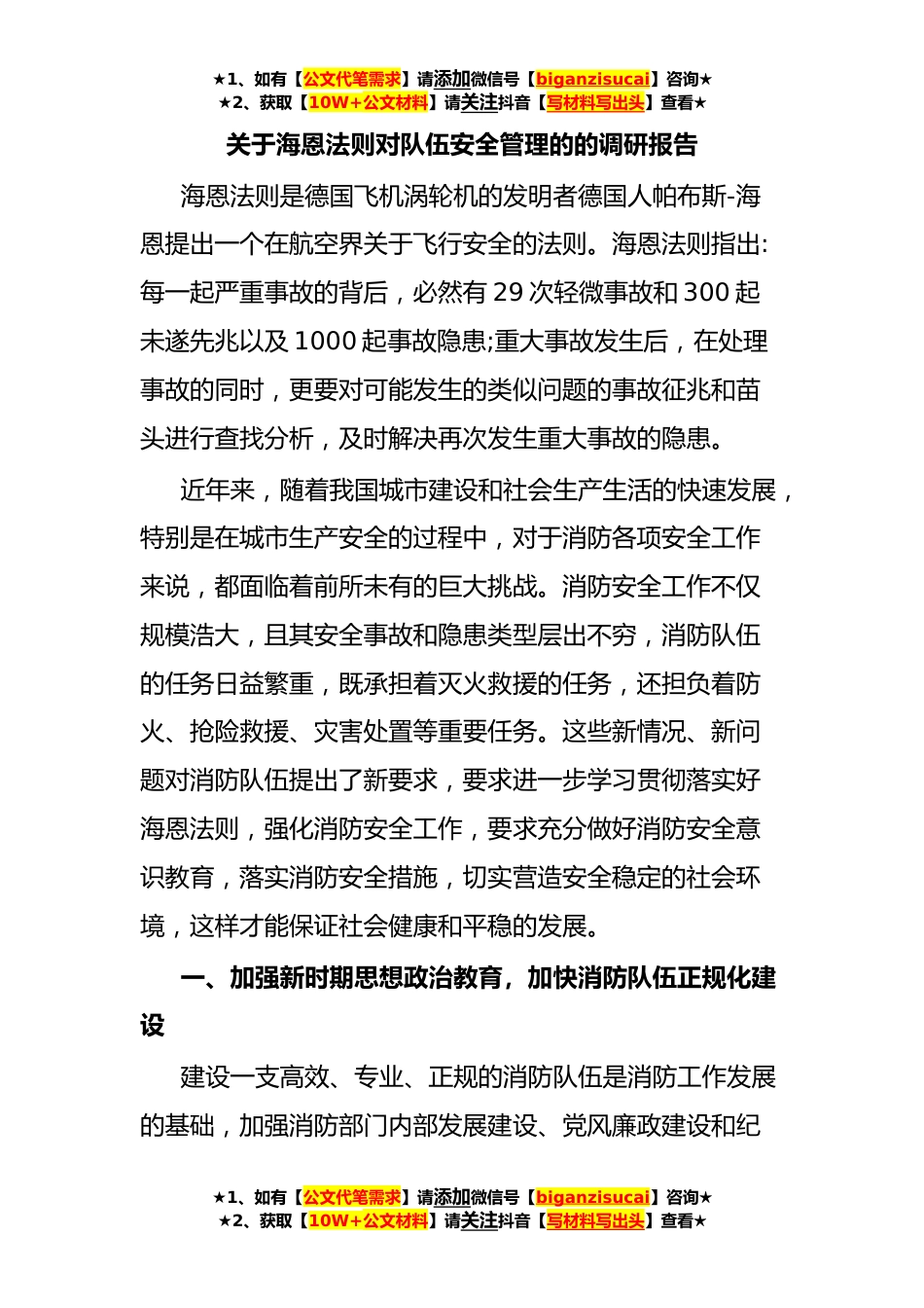 ★1、如有【公文代笔需求】请添加微信号【biganzisucai】咨询★★2、获取【10W+公文材料】请关注抖音【写材料写出头】查看★关于海恩法则对队伍安全管理的的调研报告海恩法则是德国飞机涡轮机的发明者德国人帕布斯-海恩提出一个在航空界关于飞行安全的法则。海恩法则指出:每一起严重事故的背后,必然有29次轻微事故和300起未遂先兆以及1000起事故隐患;重大事故发生后,在处理事故的同时,更要对可能发生的类似问题的事故征兆和苗头进行查找分析,及时解决再次发生重大事故的隐患。近年来,随着我国城市建设和社会生产生活的快速发展,特别是在城市生产安全的过程中,对于消防各项安全工作来说,都面临着前所未有的巨大挑战。消防安全工作不仅规模浩大,且其安全事故和隐患类型层出不穷,消防队伍的任务日益繁重,...