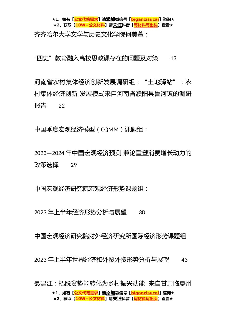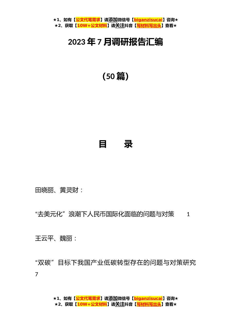 ★1、如有【公文代笔需求】请添加微信号【biganzisucai】咨询★★2、获取【10W+公文材料】请关注抖音【写材料写出头】查看★2023年7月调研报告汇编(50篇)目录田晓丽、黄灵财:“去美元化”浪潮下人民币国际化面临的问题与对策1王云平、魏丽:“双碳”目标下我国产业低碳转型存在的问题与对策研究7★1、如有【公文代笔需求】请添加微信号【biganzisucai】咨询★★2、获取【10W+公文材料】请关注抖音【写材料写出头】查看★★1、如有【公文代笔需求】请添加微信号【biganzisucai】咨询★★2、获取【10W+公文材料】请关注抖音【写材料写出头】查看★齐齐哈尔大学文学与历史文化学院何美萱:“四史”教育融入高校思政课存在的问题及对策13河南省农村集体经济创新发展调研组:“土地驿站”:农村集体经济创新发展模式...