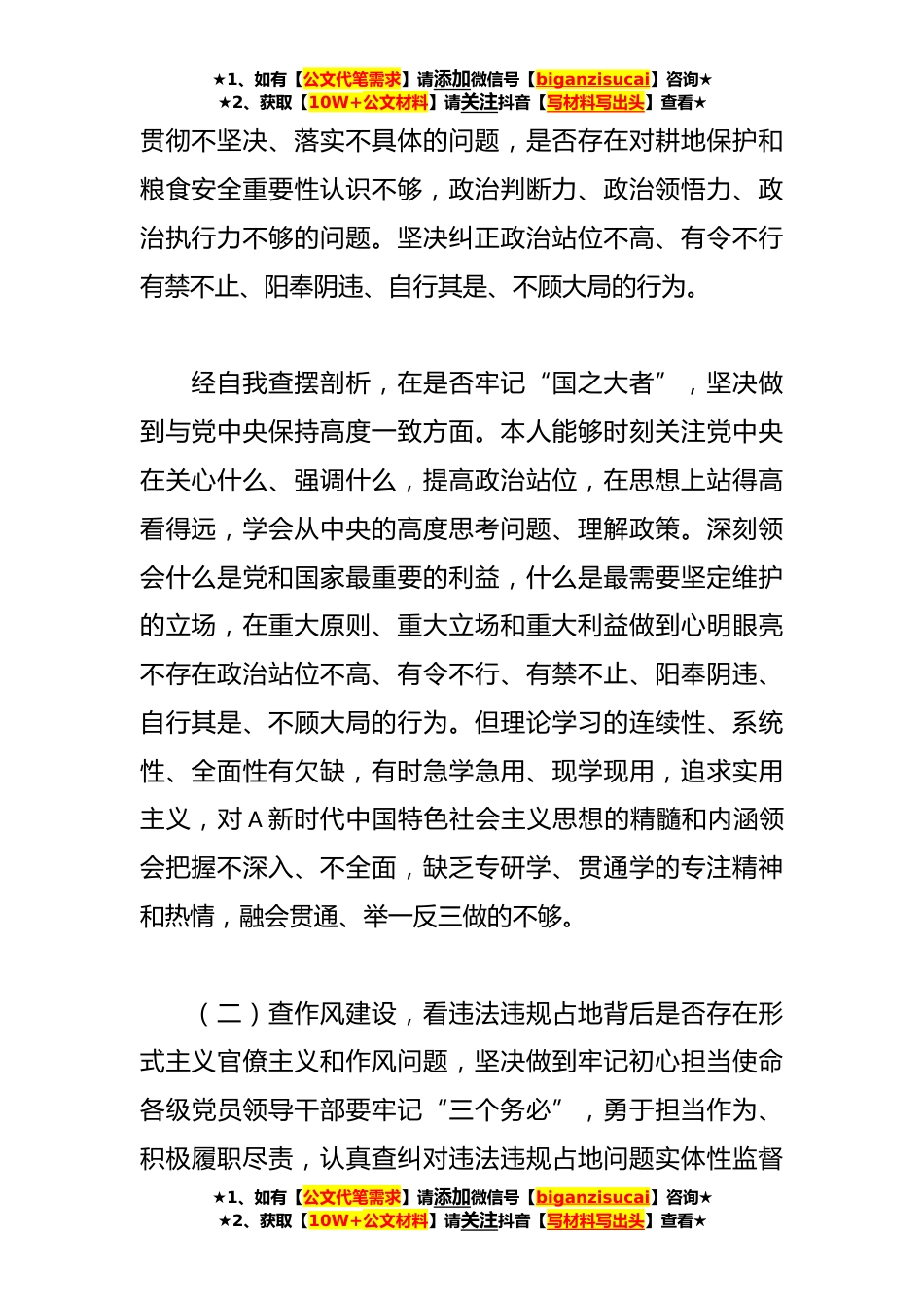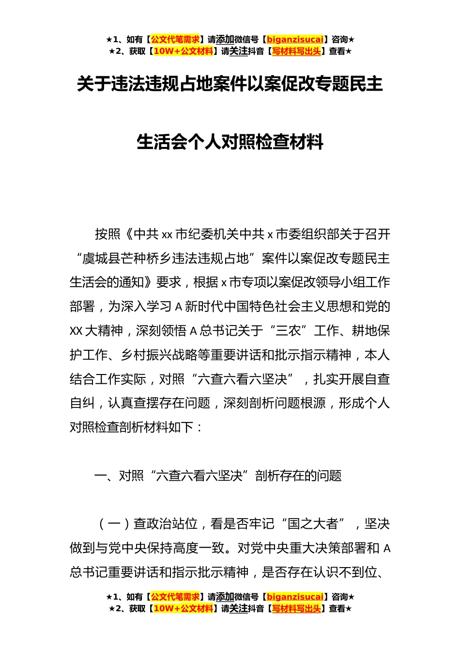 ★1、如有【公文代笔需求】请添加微信号【biganzisucai】咨询★★2、获取【10W+公文材料】请关注抖音【写材料写出头】查看★关于违法违规占地案件以案促改专题民主生活会个人对照检查材料按照《中共xx市纪委机关中共x市委组织部关于召开“虞城县芒种桥乡违法违规占地”案件以案促改专题民主生活会的通知》要求,根据x市专项以案促改领导小组工作部署,为深入学习A新时代中国特色社会主义思想和党的XX大精神,深刻领悟A总书记关于“三农”工作、耕地保护工作、乡村振兴战略等重要讲话和批示指示精神,本人结合工作实际,对照“六查六看六坚决”,扎实开展自查自纠,认真查摆存在问题,深刻剖析问题根源,形成个人对照检查剖析材料如下:一、对照“六查六看六坚决”剖析存在的问题(一)查政治站位,看是否牢记“国...