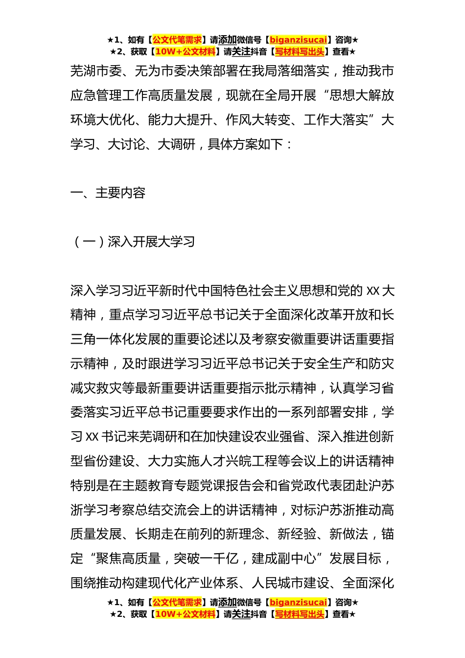 ★1、如有【公文代笔需求】请添加微信号【biganzisucai】咨询★★2、获取【10W+公文材料】请关注抖音【写材料写出头】查看★XX局开展“思想大解放、环境大优化、能力大提升、作风大转变、工作大落实”大学习、大讨论、大调研实施方案为深入学习贯彻党的XX大精神和习近平总书记重要讲话重要指示精神,扎实做好第二批主题教育前期准备工作,全面落实省委学习贯彻习近平新时代中国特色社会主义思想主题教育专题党课报告会、省党政代表团赴沪苏浙学习考察总结交流会精神,落实省委对标沪苏浙、学习新经验、追赶优等生等工作要求以及芜湖市委有关工作部署,进一步统一思想、鼓足干劲,深度融入长三角高质量一体化发展大局,奋力打造“一地四区”、加快建设芜湖市域副中心城市,不断谱写现代化无为建设新篇章。为确保省...