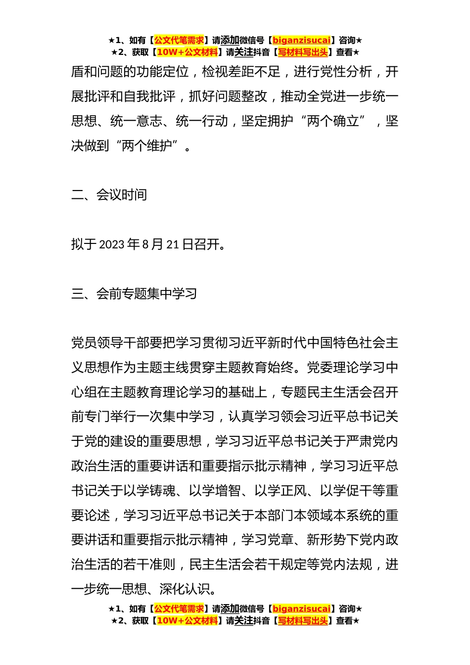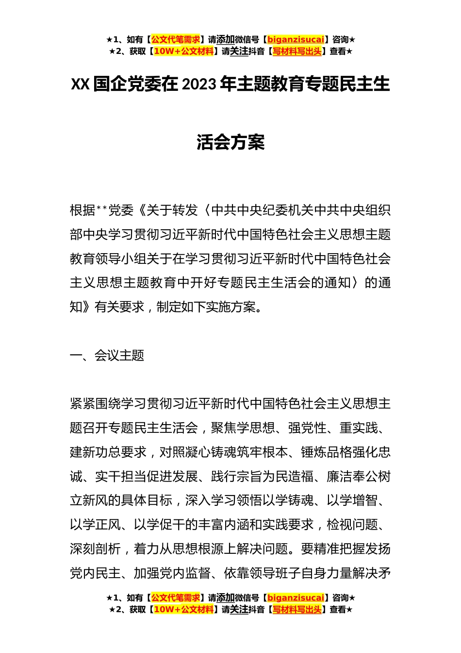 ★1、如有【公文代笔需求】请添加微信号【biganzisucai】咨询★★2、获取【10W+公文材料】请关注抖音【写材料写出头】查看★XX国企党委在2023年主题教育专题民主生活会方案根据**党委《关于转发〈中共中央纪委机关中共中央组织部中央学习贯彻习近平新时代中国特色社会主义思想主题教育领导小组关于在学习贯彻习近平新时代中国特色社会主义思想主题教育中开好专题民主生活会的通知〉的通知》有关要求,制定如下实施方案。一、会议主题紧紧围绕学习贯彻习近平新时代中国特色社会主义思想主题召开专题民主生活会,聚焦学思想、强党性、重实践、建新功总要求,对照凝心铸魂筑牢根本、锤炼品格强化忠诚、实干担当促进发展、践行宗旨为民造福、廉洁奉公树立新风的具体目标,深入学习领悟以学铸魂、以学增智、以学正风、...