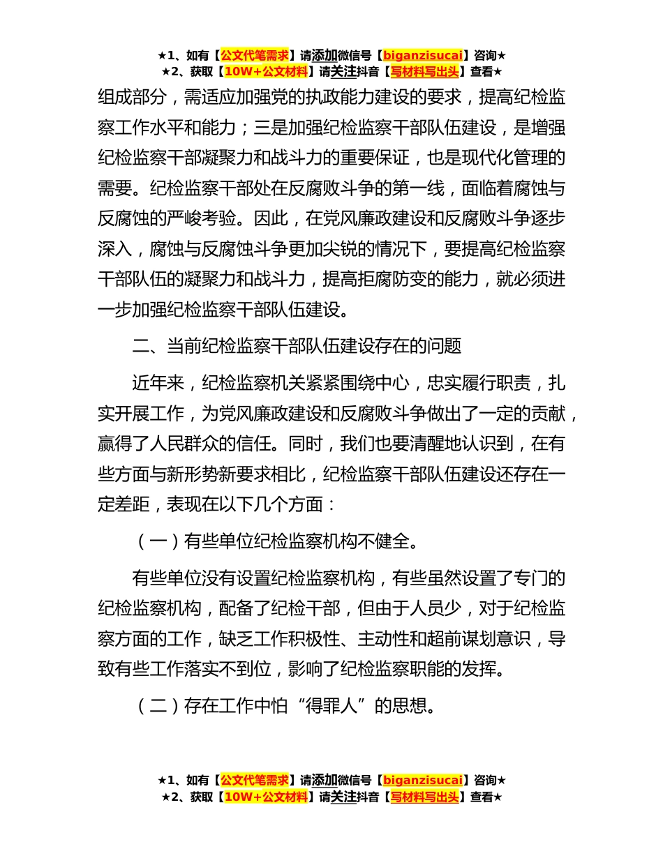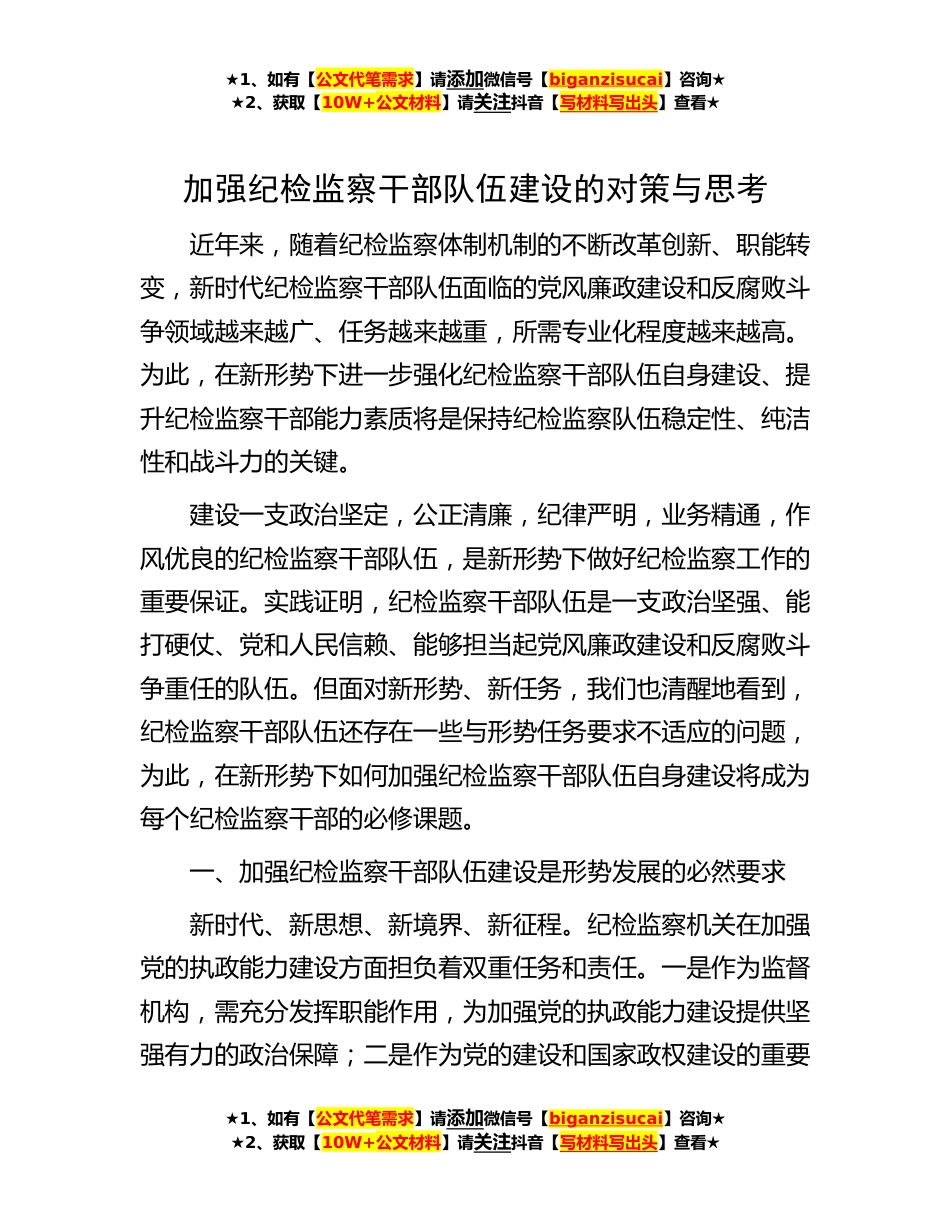 ★1、如有【公文代笔需求】请添加微信号【biganzisucai】咨询★★2、获取【10W+公文材料】请关注抖音【写材料写出头】查看★加强纪检监察干部队伍建设的对策与思考近年来,随着纪检监察体制机制的不断改革创新、职能转变,新时代纪检监察干部队伍面临的党风廉政建设和反腐败斗争领域越来越广、任务越来越重,所需专业化程度越来越高。为此,在新形势下进一步强化纪检监察干部队伍自身建设、提升纪检监察干部能力素质将是保持纪检监察队伍稳定性、纯洁性和战斗力的关键。建设一支政治坚定,公正清廉,纪律严明,业务精通,作风优良的纪检监察干部队伍,是新形势下做好纪检监察工作的重要保证。实践证明,纪检监察干部队伍是一支政治坚强、能打硬仗、党和人民信赖、能够担当起党风廉政建设和反腐败斗争重任的队伍。...