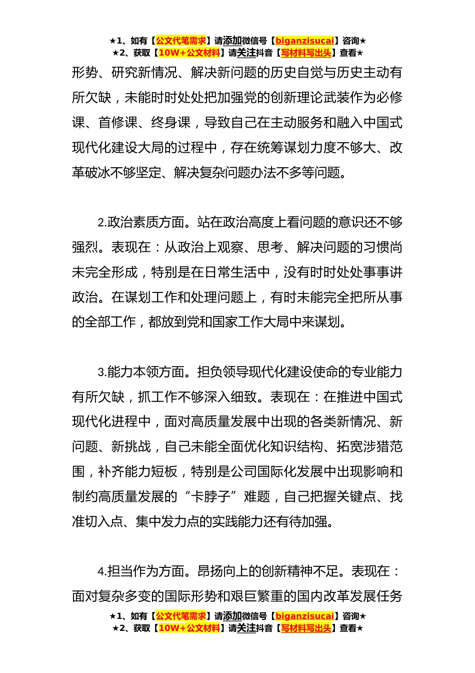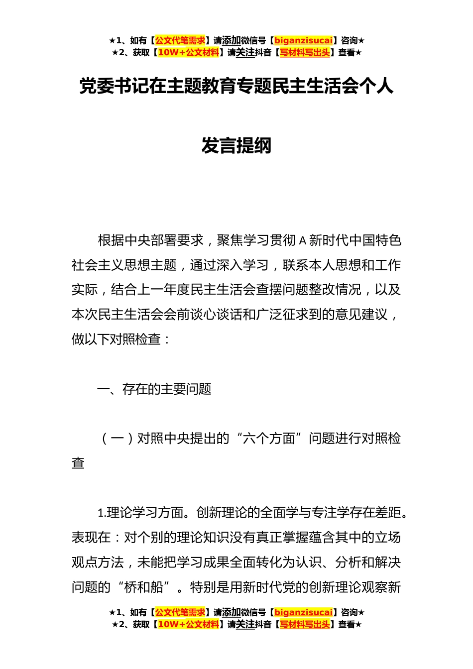 ★1、如有【公文代笔需求】请添加微信号【biganzisucai】咨询★★2、获取【10W+公文材料】请关注抖音【写材料写出头】查看★党委书记在主题教育专题民主生活会个人发言提纲根据中央部署要求,聚焦学习贯彻A新时代中国特色社会主义思想主题,通过深入学习,联系本人思想和工作实际,结合上一年度民主生活会查摆问题整改情况,以及本次民主生活会会前谈心谈话和广泛征求到的意见建议,做以下对照检查:一、存在的主要问题(一)对照中央提出的“六个方面”问题进行对照检查1.理论学习方面。创新理论的全面学与专注学存在差距。表现在:对个别的理论知识没有真正掌握蕴含其中的立场观点方法,未能把学习成果全面转化为认识、分析和解决问题的“桥和船”。特别是用新时代党的创新理论观察新★1、如有【公文代笔需求】...