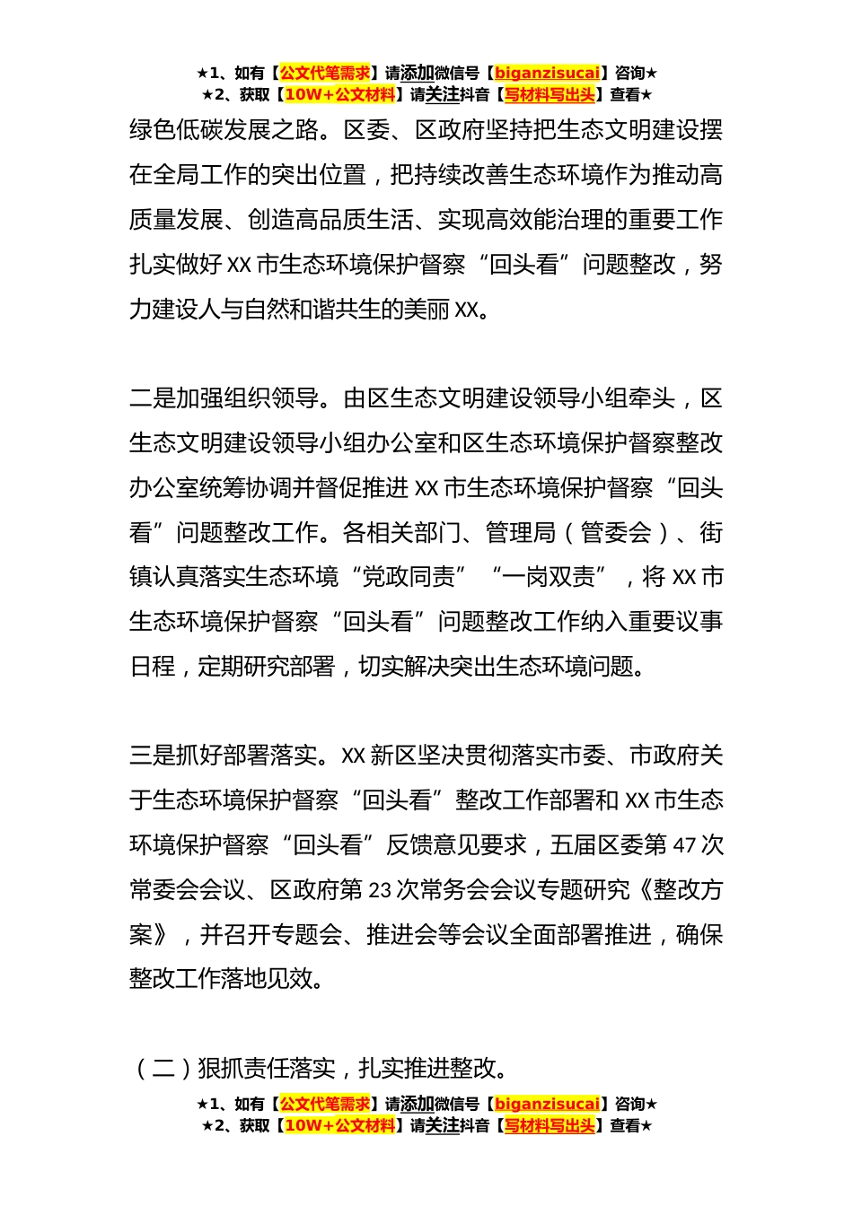 ★1、如有【公文代笔需求】请添加微信号【biganzisucai】咨询★★2、获取【10W+公文材料】请关注抖音【写材料写出头】查看★关于贯彻落实某市生态环境保护督察“回头看”反馈意见整改情况的报告2022年X月19日至28日,XX市第一生态环境保护督察组对XX新区开展了生态环境保护督察“回头看”,于2022年11月25日向XX新区反馈了督察“回头看”意见。XX新区区委、区政府高度重视生态环境保护和督察“回头看”整改工作,制定了《XX新区贯彻落实XX市生态环境保护督察“回头看”反馈意见整改方案》(X〔2023〕X号,以下简称《整改方案》),全力推进整改工作。现将整改情况报告如下:一、整改工作落实总体情况(一)提高政治站位,加强组织领导。一是提高思想认识。XX新区深入学习贯彻习近平生态文明思想,全面贯彻落实党的...