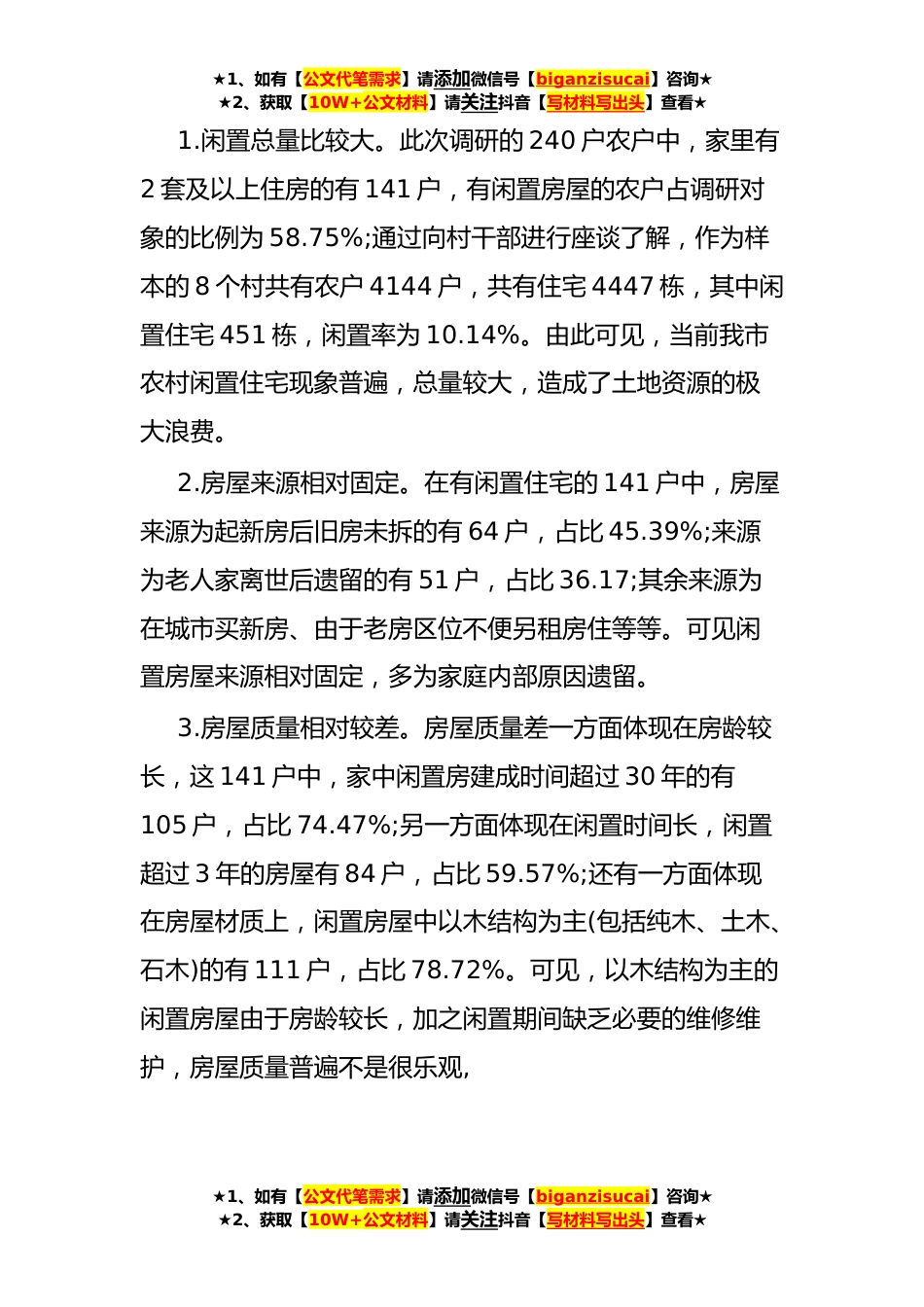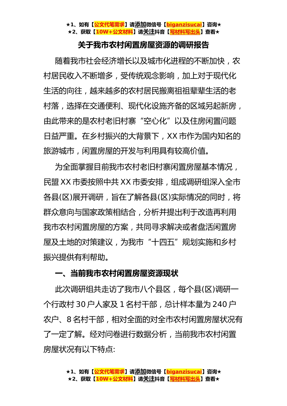 ★1、如有【公文代笔需求】请添加微信号【biganzisucai】咨询★★2、获取【10W+公文材料】请关注抖音【写材料写出头】查看★关于我市农村闲置房屋资源的调研报告随着我市社会经济增长以及城市化进程的不断加快,农村居民收入不断增多,受传统观念影响,加上对于现代化生活的向往,越来越多的农村居民搬离祖祖辈辈生活的老村落,选择在交通便利、现代化设施齐备的区域另起新房,由此带来的是农村老旧村寨“空心化”以及住房闲置问题日益严重。在乡村振兴的大背景下,XX市作为国内知名的旅游城市,闲置房屋的开发与利用具有较高价值。为全面掌握目前我市农村老旧村寨闲置房屋基本情况,民盟XX市委按照中共XX市委安排,组成调研组深入全市各县(区)展开调研,旨在了解各县(区)实际情况的同时,将群众意向与国家政策相...