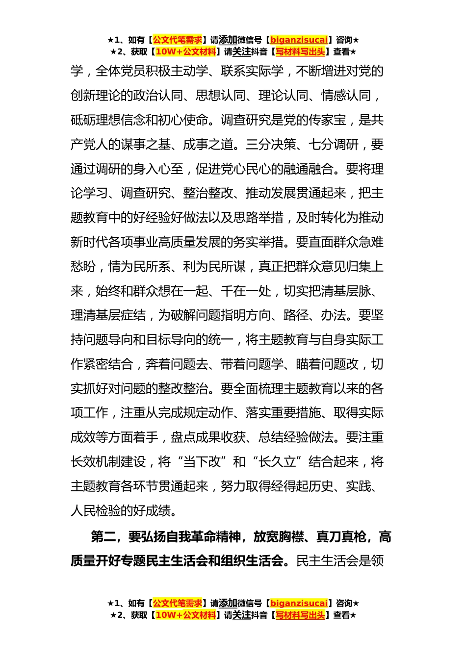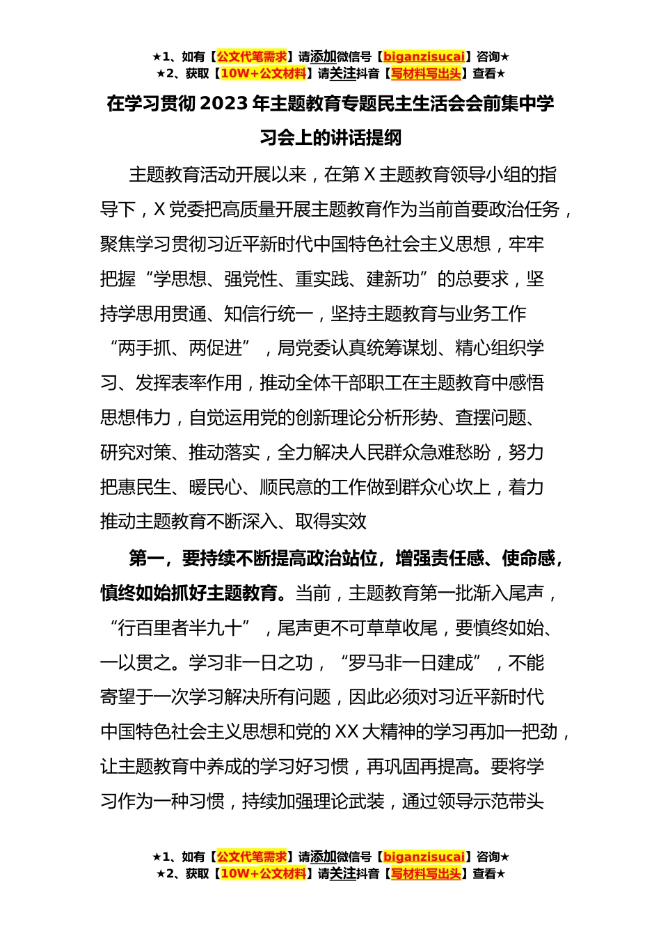 ★1、如有【公文代笔需求】请添加微信号【biganzisucai】咨询★★2、获取【10W+公文材料】请关注抖音【写材料写出头】查看★在学习贯彻2023年主题教育专题民主生活会会前集中学习会上的讲话提纲主题教育活动开展以来,在第X主题教育领导小组的指导下,X党委把高质量开展主题教育作为当前首要政治任务,聚焦学习贯彻习近平新时代中国特色社会主义思想,牢牢把握“学思想、强党性、重实践、建新功”的总要求,坚持学思用贯通、知信行统一,坚持主题教育与业务工作“两手抓、两促进”,局党委认真统筹谋划、精心组织学习、发挥表率作用,推动全体干部职工在主题教育中感悟思想伟力,自觉运用党的创新理论分析形势、查摆问题、研究对策、推动落实,全力解决人民群众急难愁盼,努力把惠民生、暖民心、顺民意的工作做到...