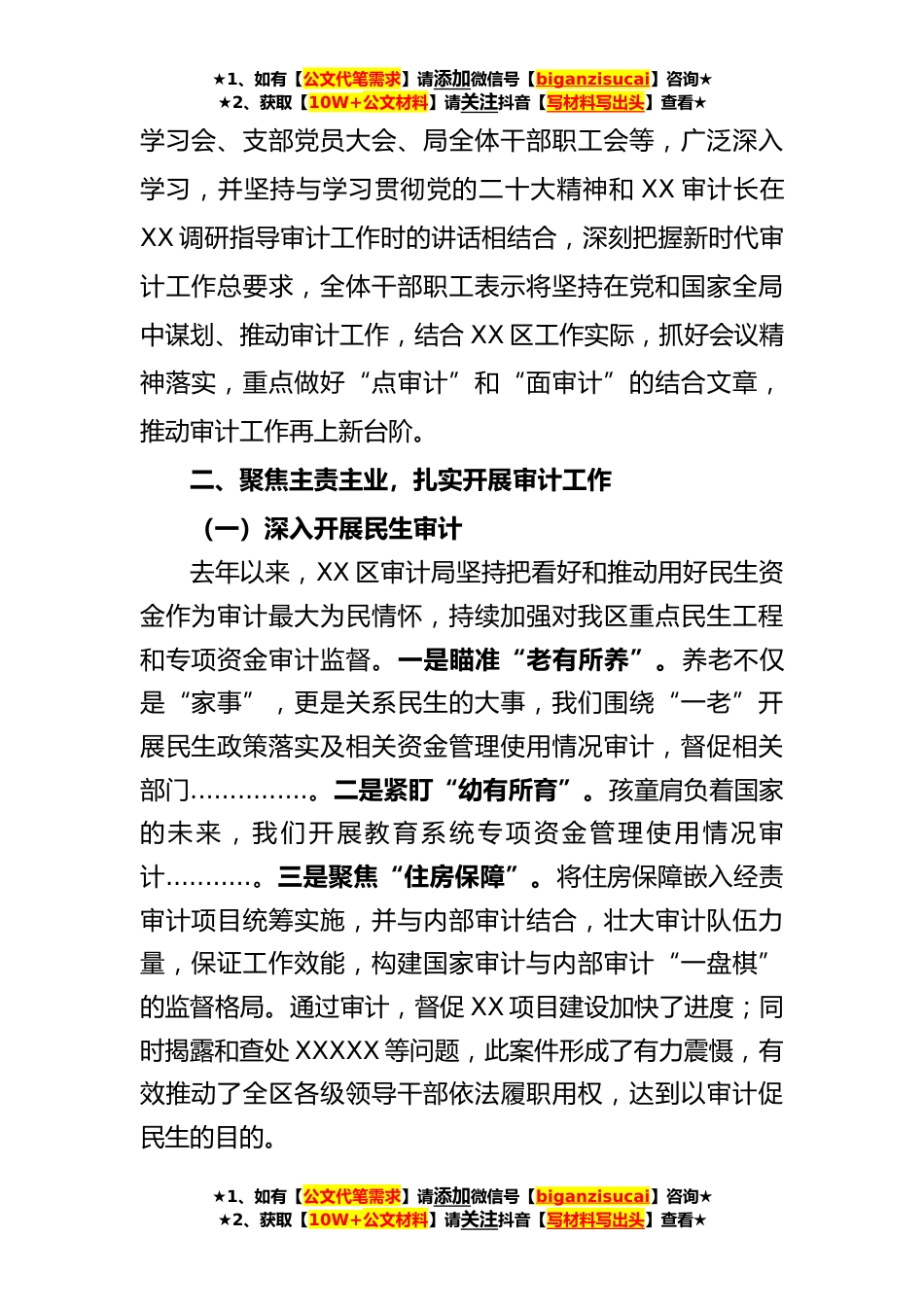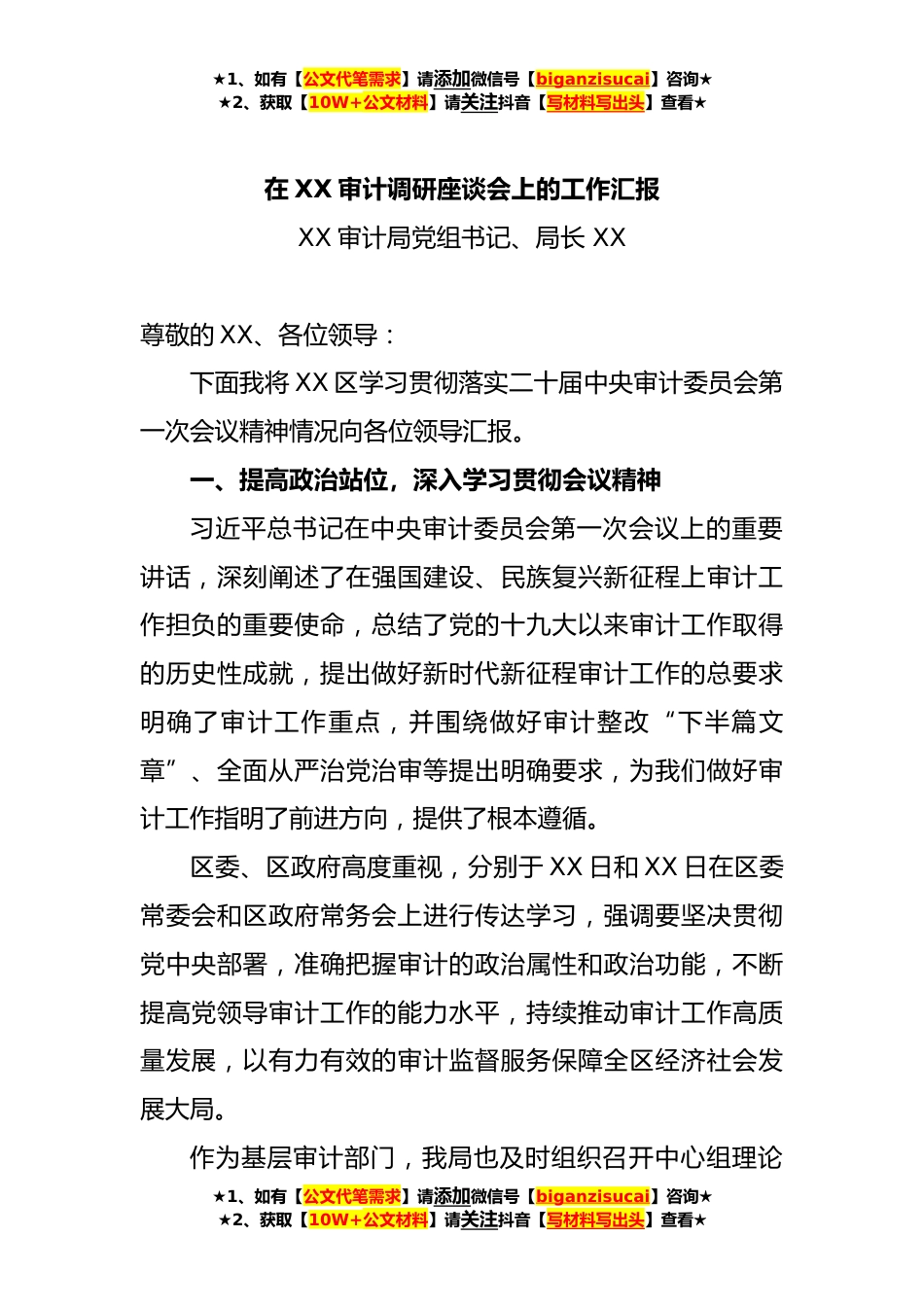 ★1、如有【公文代笔需求】请添加微信号【biganzisucai】咨询★★2、获取【10W+公文材料】请关注抖音【写材料写出头】查看★在XX审计调研座谈会上的工作汇报XX审计局党组书记、局长XX尊敬的XX、各位领导:下面我将XX区学习贯彻落实二十届中央审计委员会第一次会议精神情况向各位领导汇报。一、提高政治站位,深入学习贯彻会议精神习近平总书记在中央审计委员会第一次会议上的重要讲话,深刻阐述了在强国建设、民族复兴新征程上审计工作担负的重要使命,总结了党的十九大以来审计工作取得的历史性成就,提出做好新时代新征程审计工作的总要求明确了审计工作重点,并围绕做好审计整改“下半篇文章”、全面从严治党治审等提出明确要求,为我们做好审计工作指明了前进方向,提供了根本遵循。区委、区政府高度重视,分...